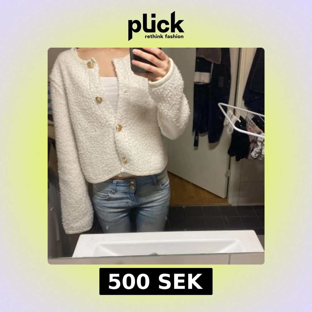 Säljer en fluffig och mysig vit kofta med dekorativa guldknappar. Koftan är croppad och har lång ärm, perfekt att slänga på sig över ett linne eller t-shirt. Passar dig som gillar en stilren och enkel look.