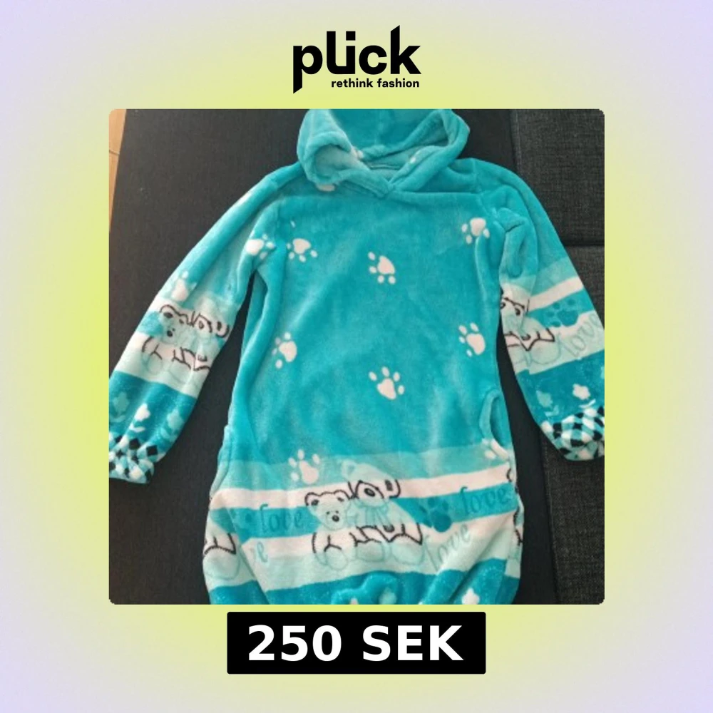 Supermjuk turkos oodie i fleece med söta nallebjörnar, tassavtryck och texten 'love' i vitt och blått. Tröjan har huva, långa ärmar och elastisk nederkant. Perfekt för mysiga dagar hemma när du vill ha något riktigt bekvämt och gulligt på dig. Finns en liten slit under armhålan men ingenting man märker av.