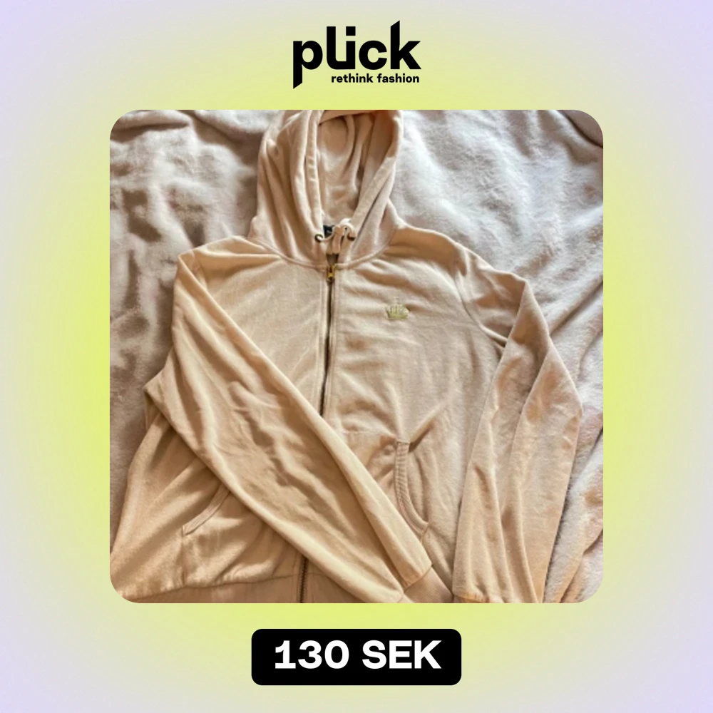Beige/vit velour zip up tröja med guld text Färgen är inte exakt som på bilden‼️ Defekter: Finns liten fläck under vänstra armen som på 3:de bilden