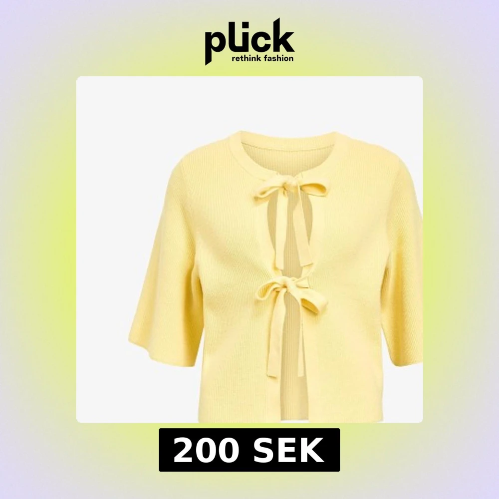 Superfin ljusgul kofta i ribbstickad bomull med två knytband framtill. Koftan har trekvartsärmar och en croppad passform som ger en fräsch och trendig look. Perfekt att slänga över ett linne eller klänning för en söt vibe.nypris 599kr. Ny , bara testad.