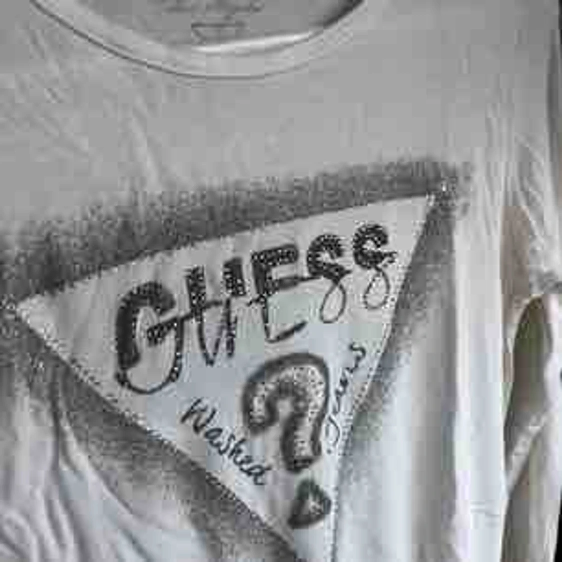 En krämvit tröja i jätteskönt material från Guess med ett tryck på framsidan.