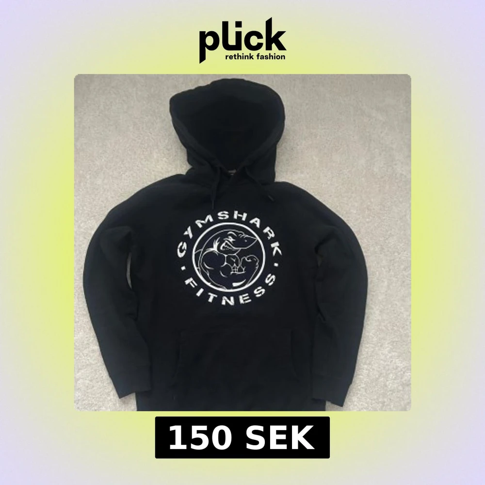 Säljer en svart hoodie från Gymshark med stort vitt tryck på bröstet där det står 'GYMSHARK FITNESS' och en muskulös haj i mitten. Tröjan har huva och magficka, perfekt för gymmet eller chill.