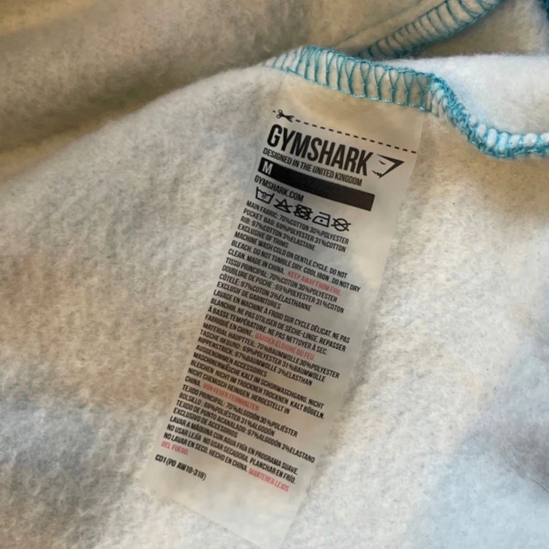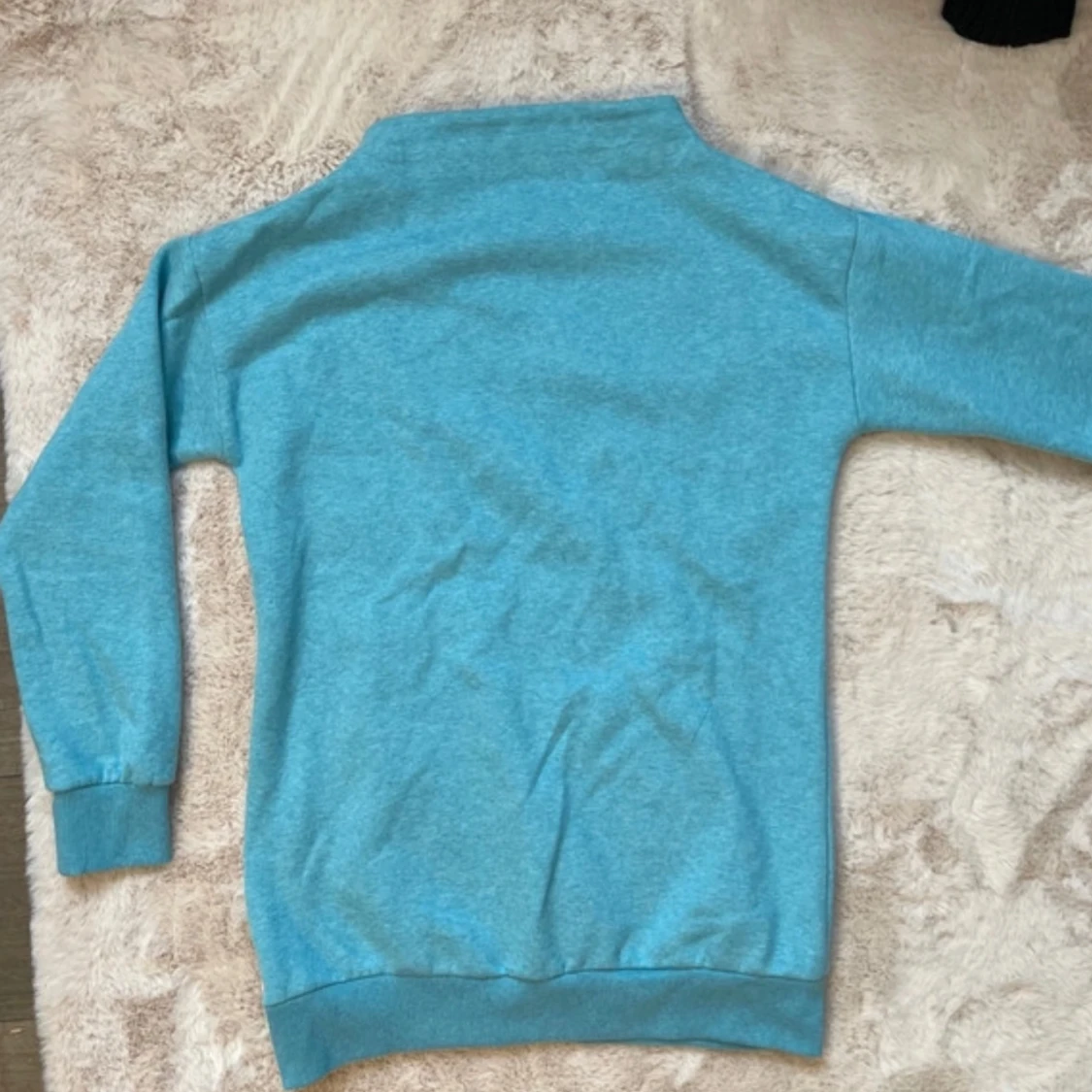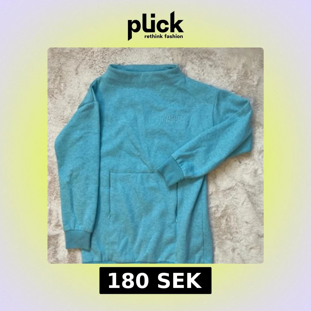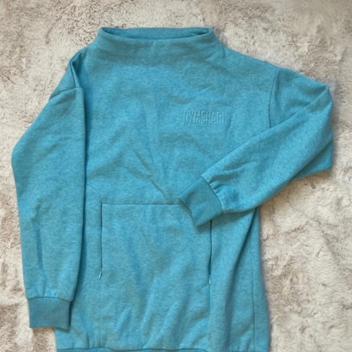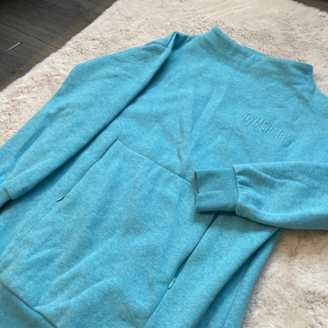 Säljer en snygg turkos tröja från Gymshark. Tröjan har en hög krage och en stor ficka framtill. Perfekt för en avslappnad stil.