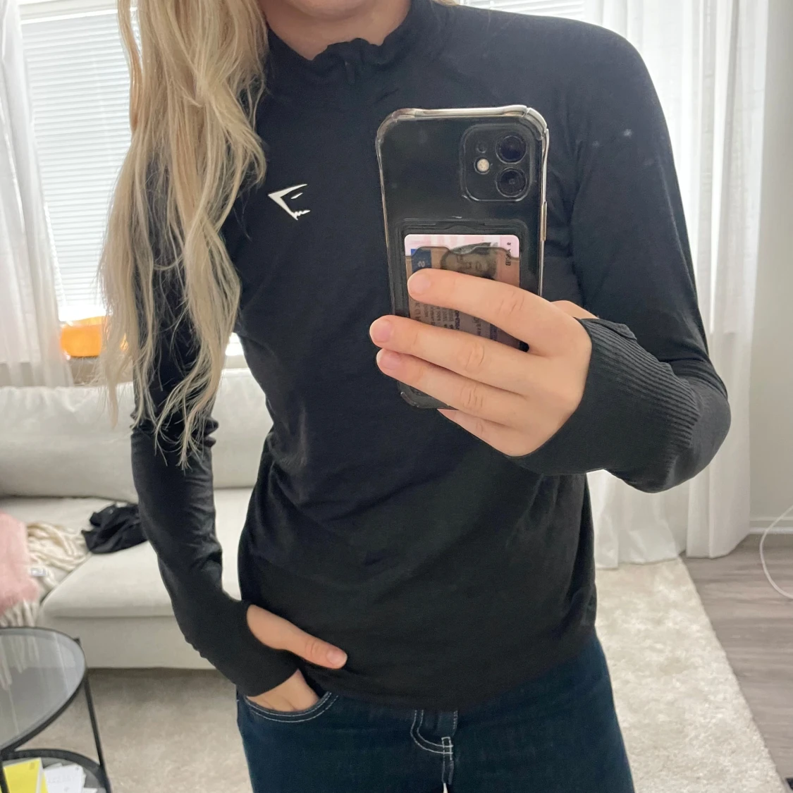 Svart långärmad tröja från Gymshark med half zip och tumhål i ärmsluten. Snyggt sportigt snitt och diskret logga på bröstet. Perfekt för träning eller chill dagar. Materialet är mjukt och stretchigt, troligen polyester eller syntet.