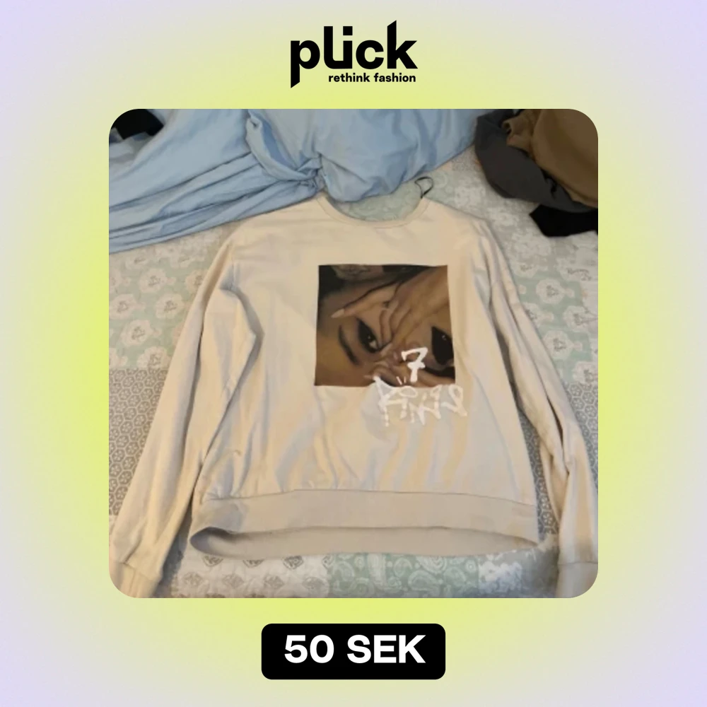 Säljer en beige sweatshirt med ett coolt tryck på framsidan. Tröjan har långa ärmar och en avslappnad passform, perfekt för vardagsbruk. Materialet känns mjukt och bekvämt, idealiskt för höst och vår.