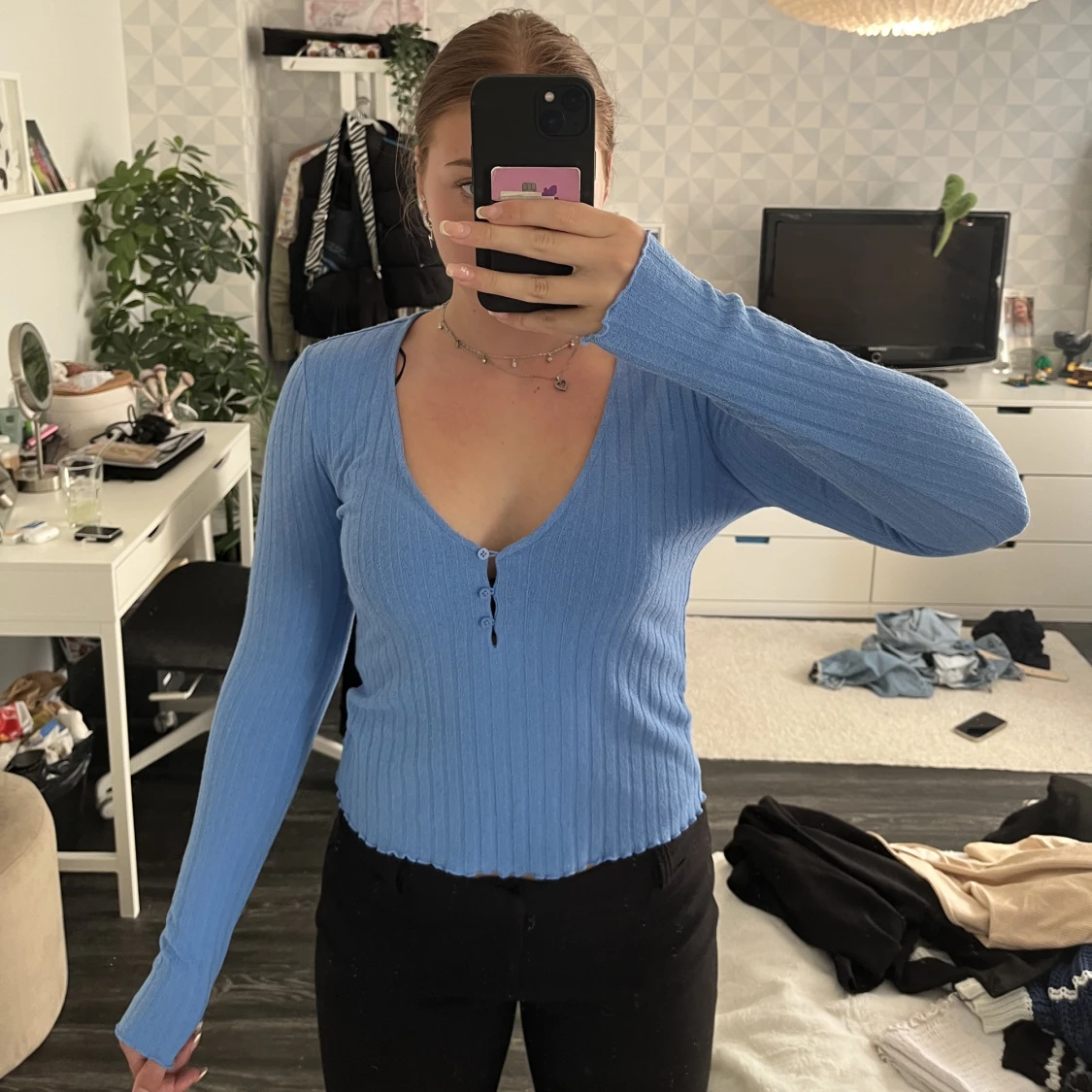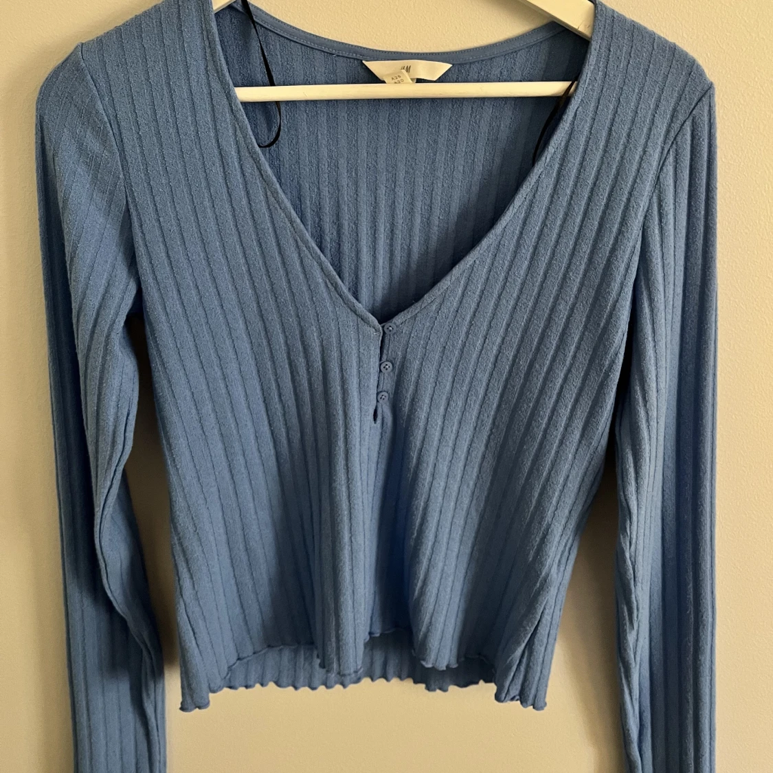 Blå v-ringad tröja från Hm i storlek M. Helt oanvänd i väldigt bra skick. Säljer för jag ej kommer använda den.