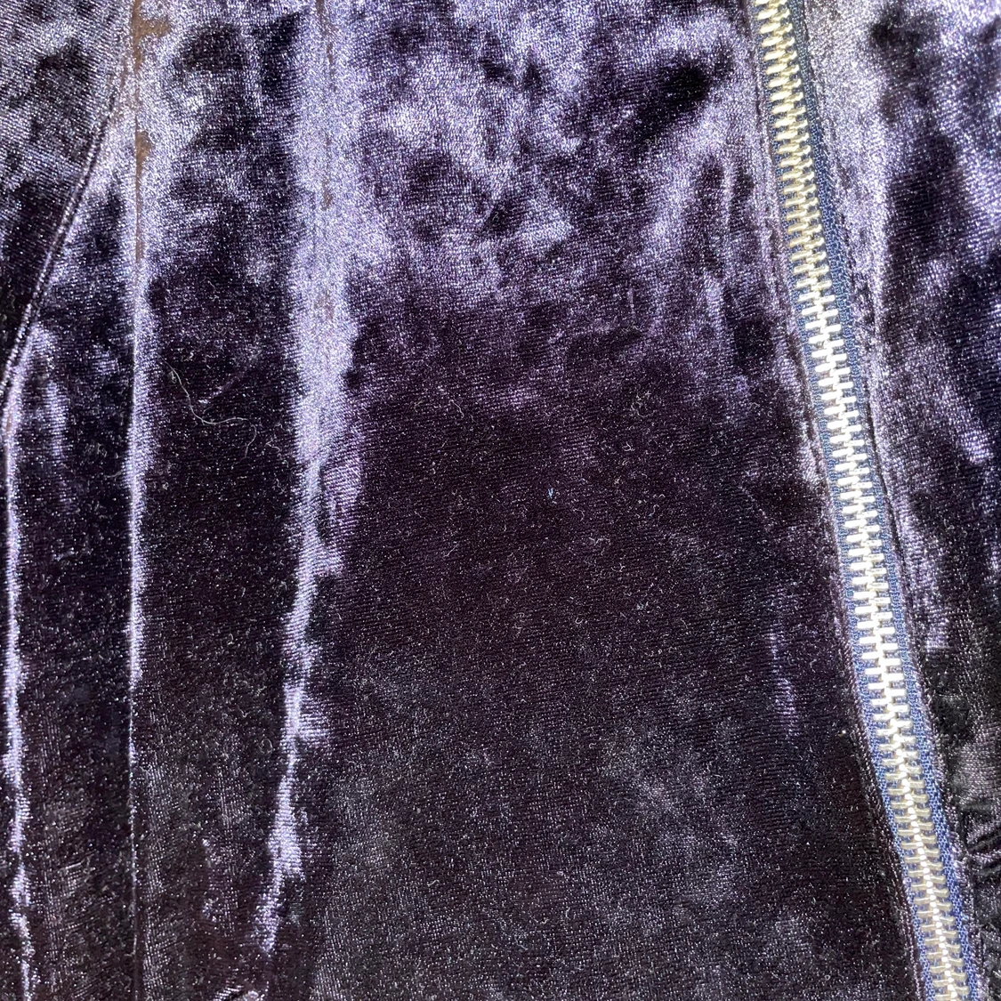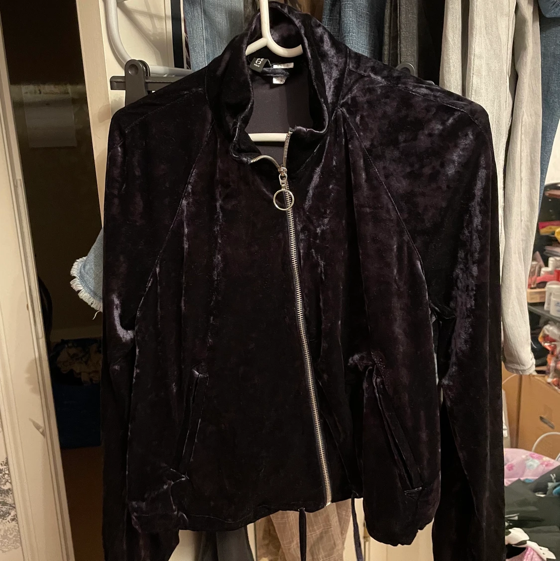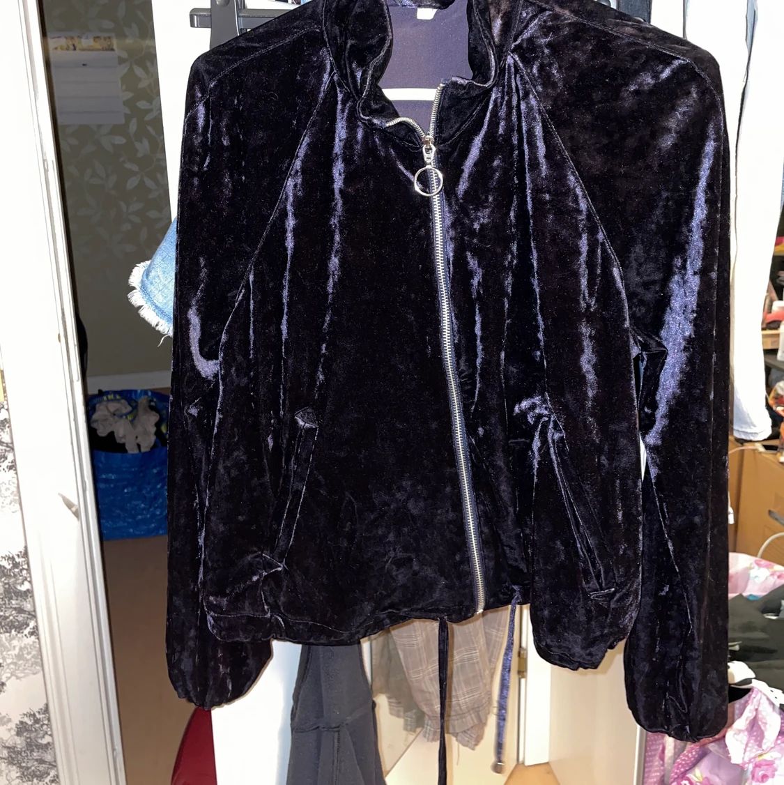 Jätte fin och skön kofta i mörk blålila sammet. Snöre nertill runt midjan som man kan dra åt om man vill. Endast använd ett par gånger och sedan har den bara hängt i garderoben. Hund finns i hemmet!