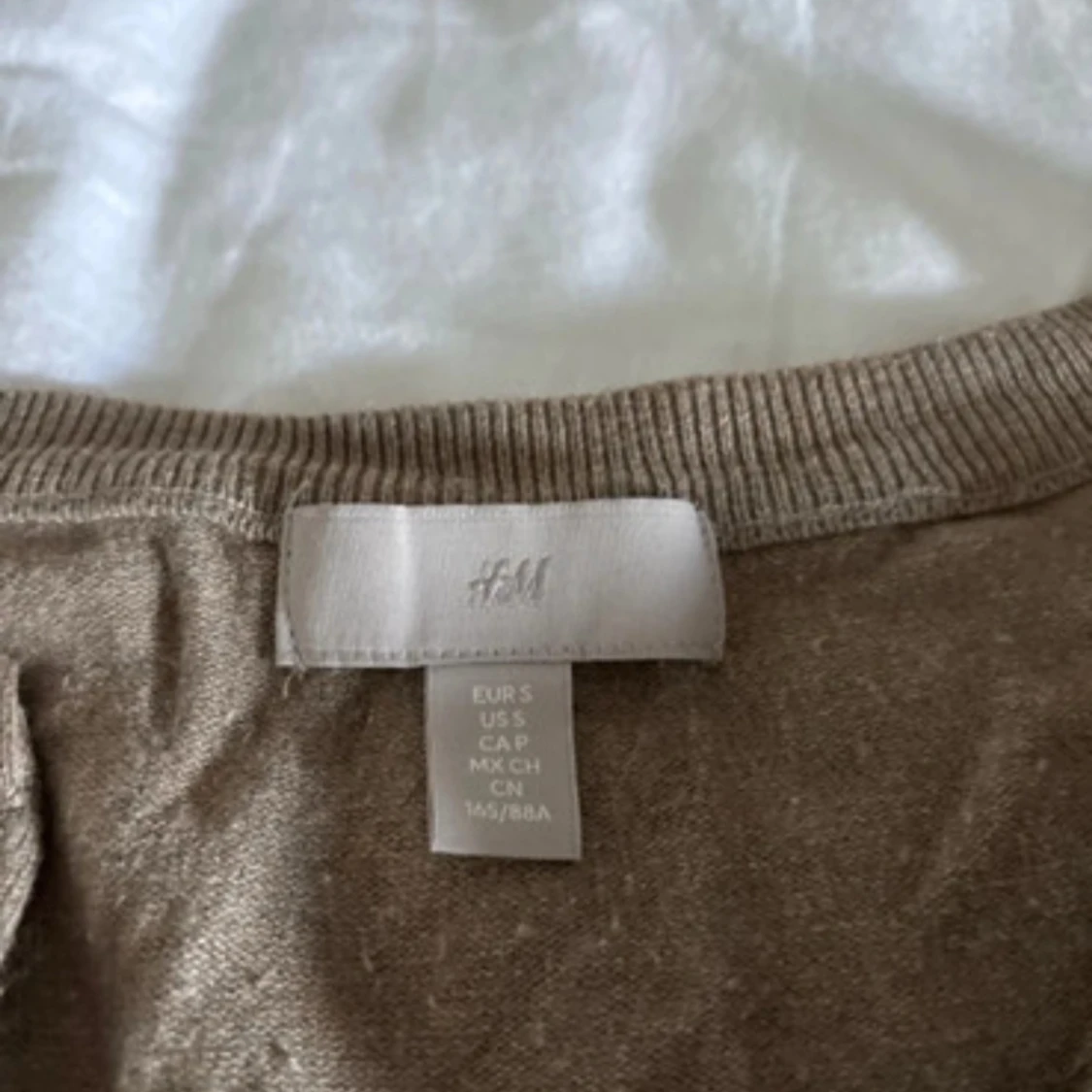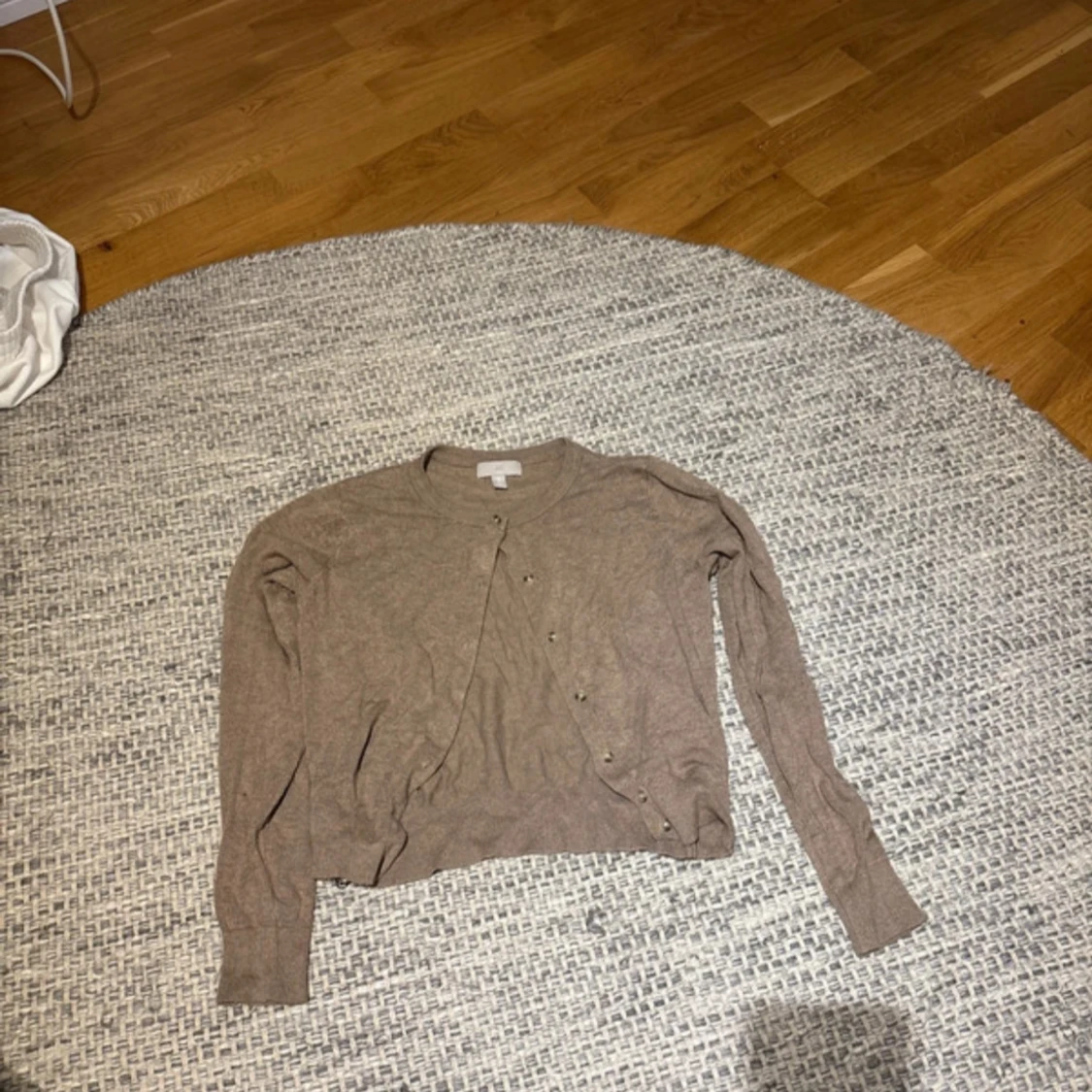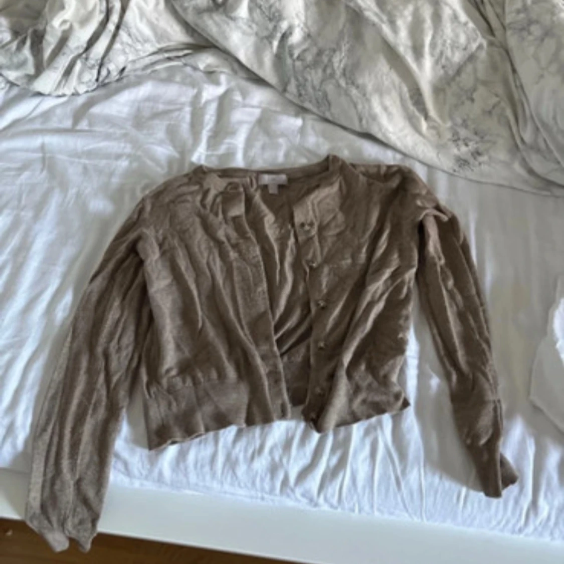 Säljer en beige kofta från H&M i storlek S. Koftan har långa ärmar, rund halsringning och knäppning framtill med små knappar. Materialet känns mjukt och lätt, den är brun/beige💕