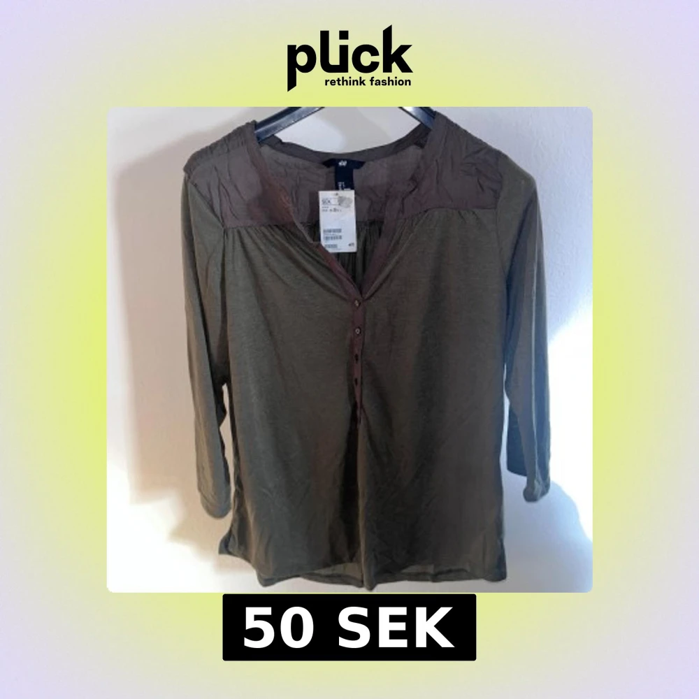 Säljer en olivgrön blus från H&M med långa ärmar och knappar framtill. Blusen har en mörkare panel upptill som ger en fin kontrast. Perfekt för en stilren look.