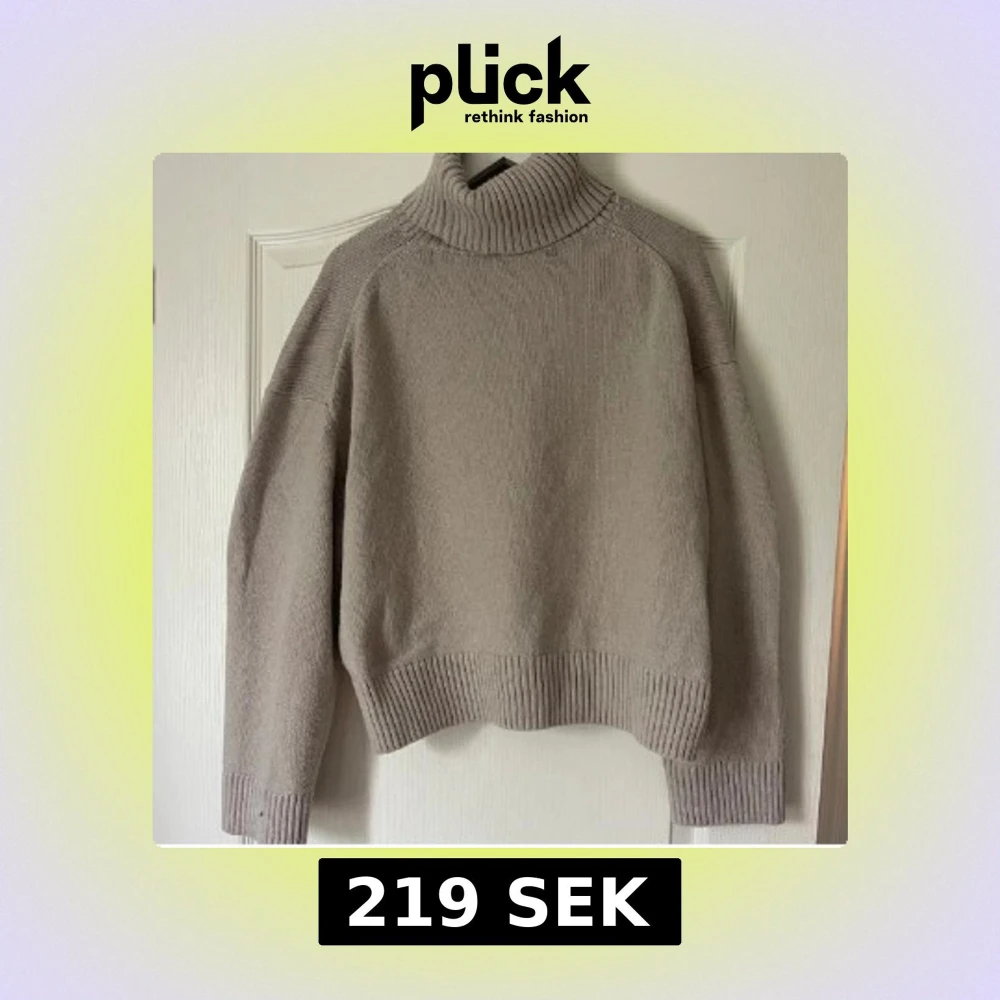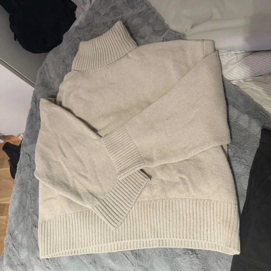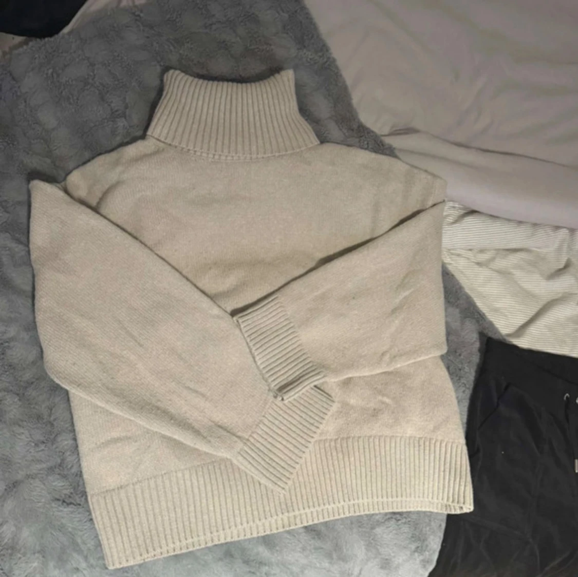 Snygg beige polotröja med bred ribbad krage och muddar. Tröjan är stickad och har en loose passform med långa ärmar. Perfekt för att hålla sig varm och se chill ut under höst och vinter. Enkel att matcha med jeans eller mjukis.