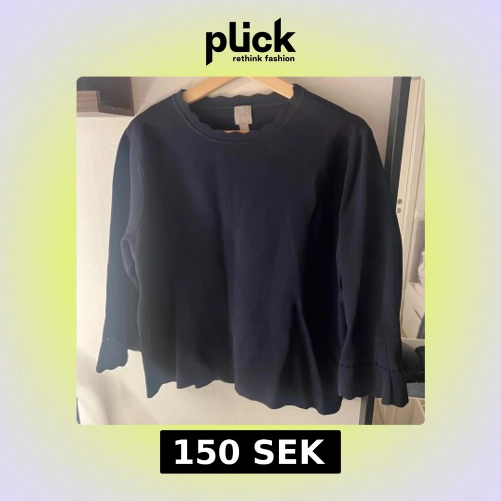 Mörkblå trekvartsärmad tröja från H&M med vågiga kanter vid halsringning, ärmslut och nederkant. Tröjan är i mjukt material och har en enkel, stilren design som passar perfekt till jeans eller kjol.