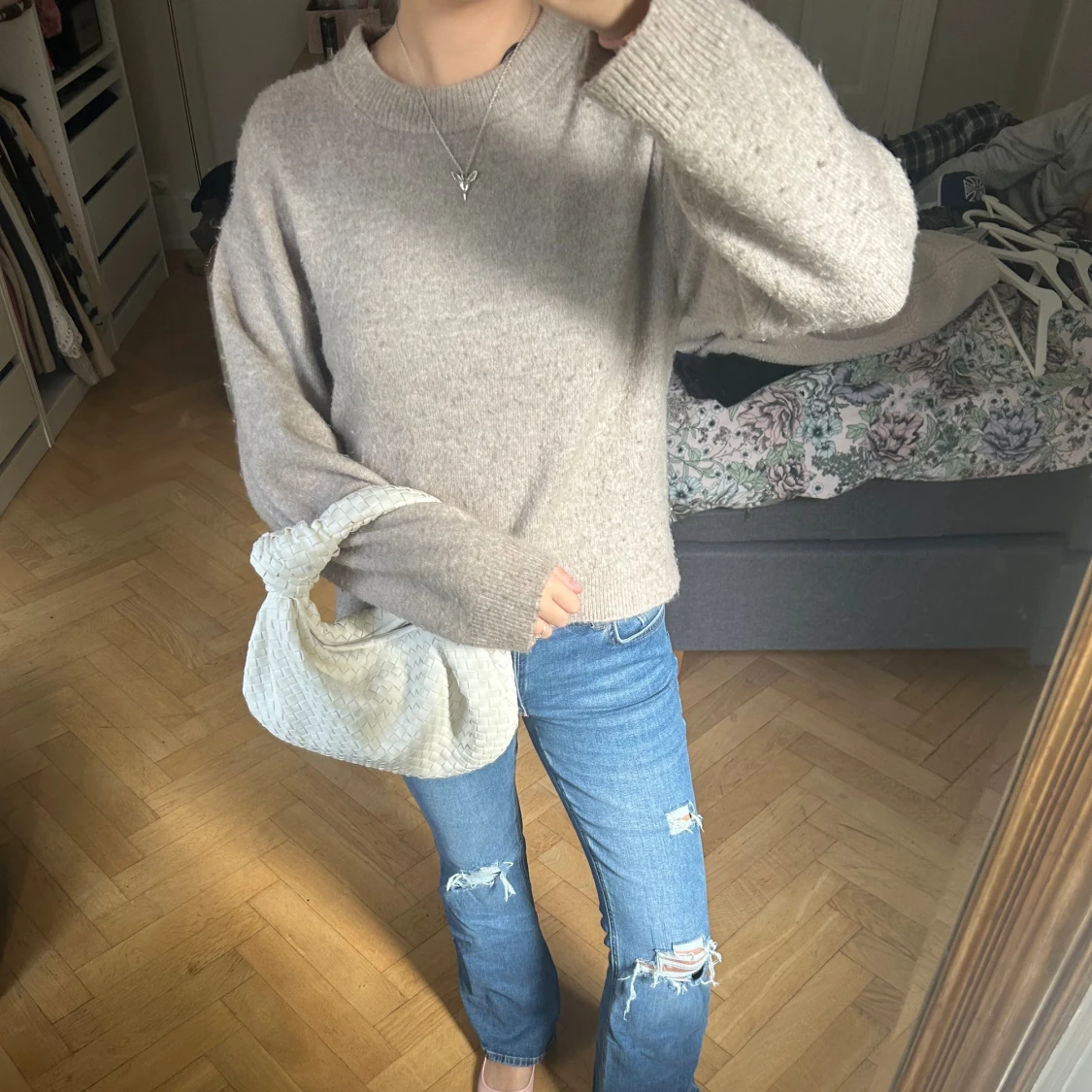Mysig beige stickad tröja med rund hals och långa ärmar. Tröjan har en loose passform och ribbade muddar vid ärmslut och nederkant. Perfekt att slänga på sig när det är lite kyligt ute. Enkel och stilren design som funkar till jeans eller kjol. Nopprig men kan försöka ta bort innan jag postar!!💓💓