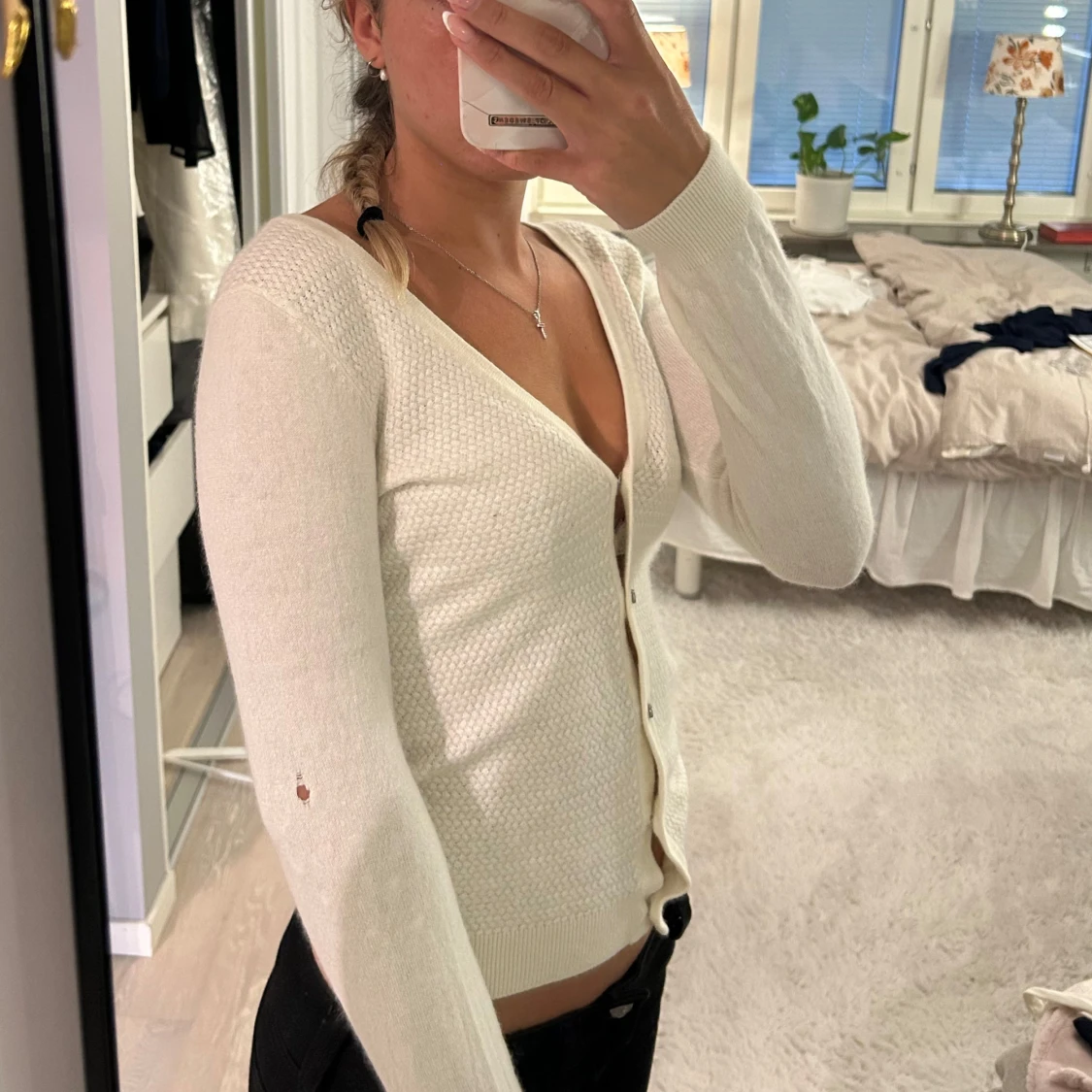 Säljer en krämvit kofta från H&M som man även kan ha som en tröja. Tröjan har ett litet hål på armen som man kan se på andra bilden.