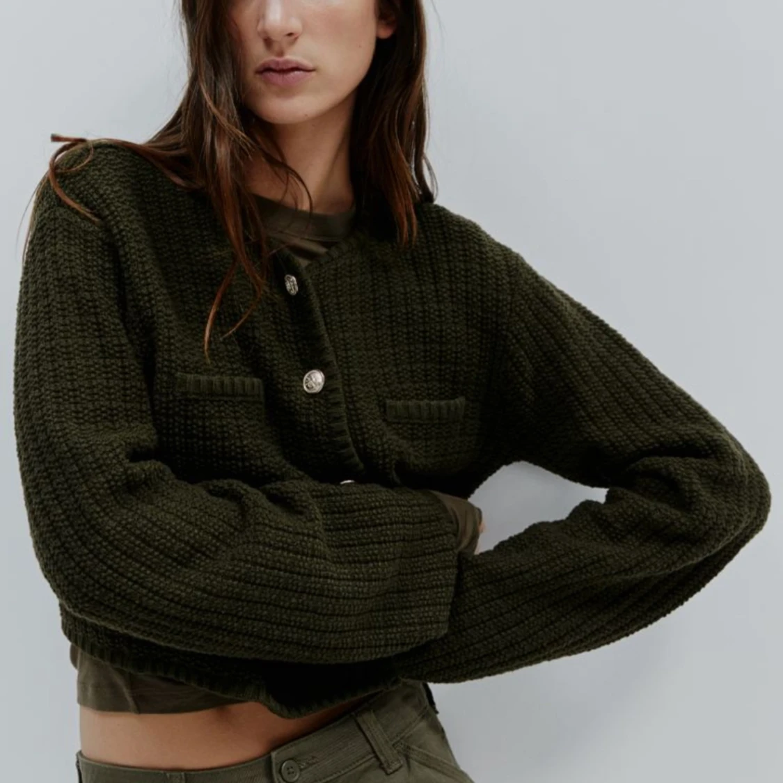 Säljer denna mörkgröna stickad kofta från hm, endast provad 1 gång så helt ny. ❤️