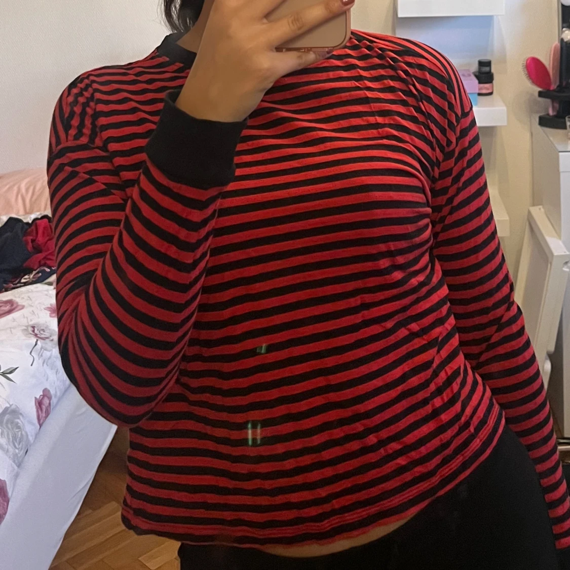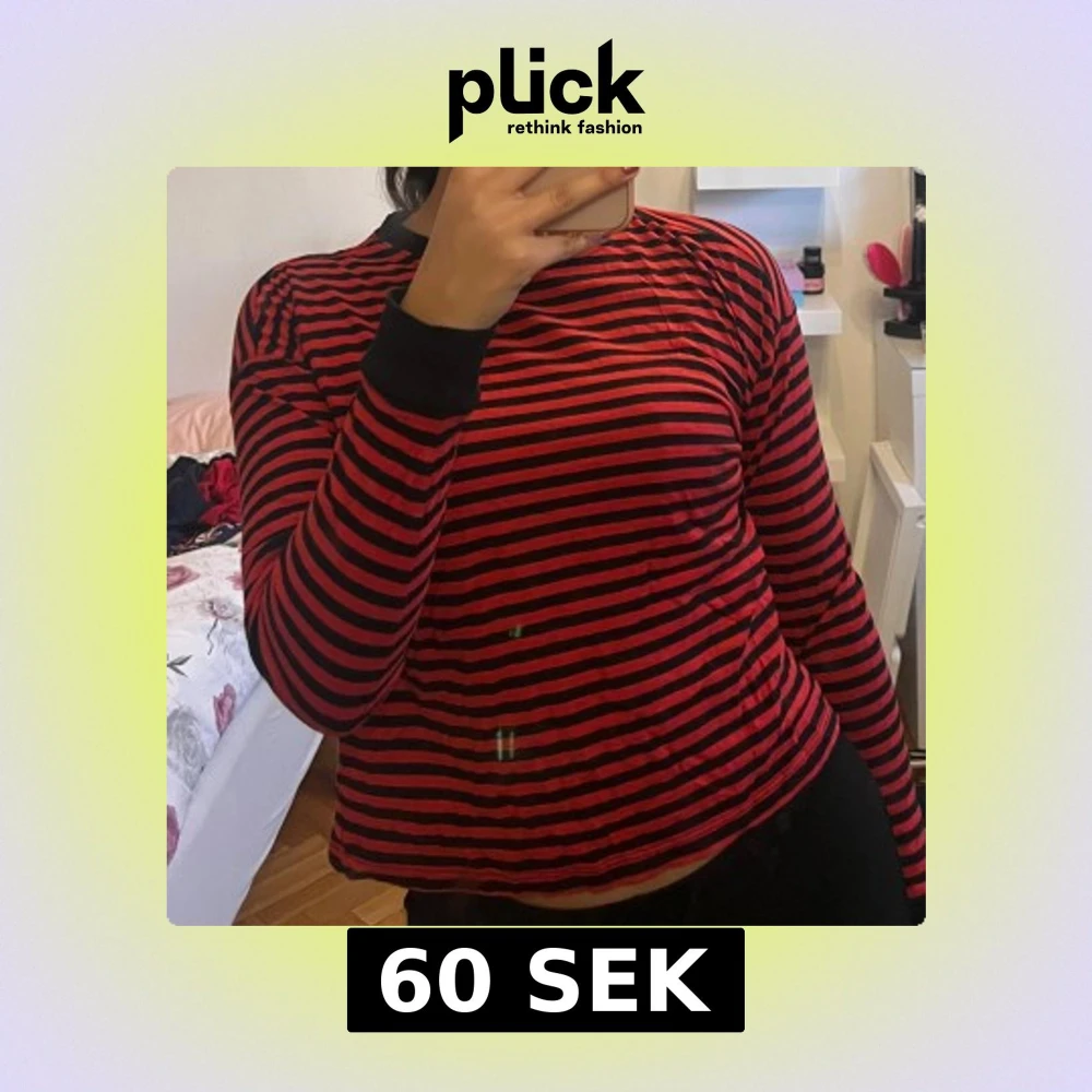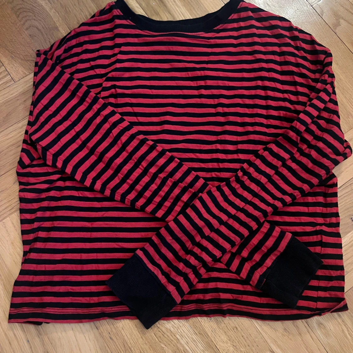 Säljer en röd och svart randig tröja med långa ärmar och svarta muddar. Perfekt för en avslappnad stil. Passar bra till jeans eller kjol.