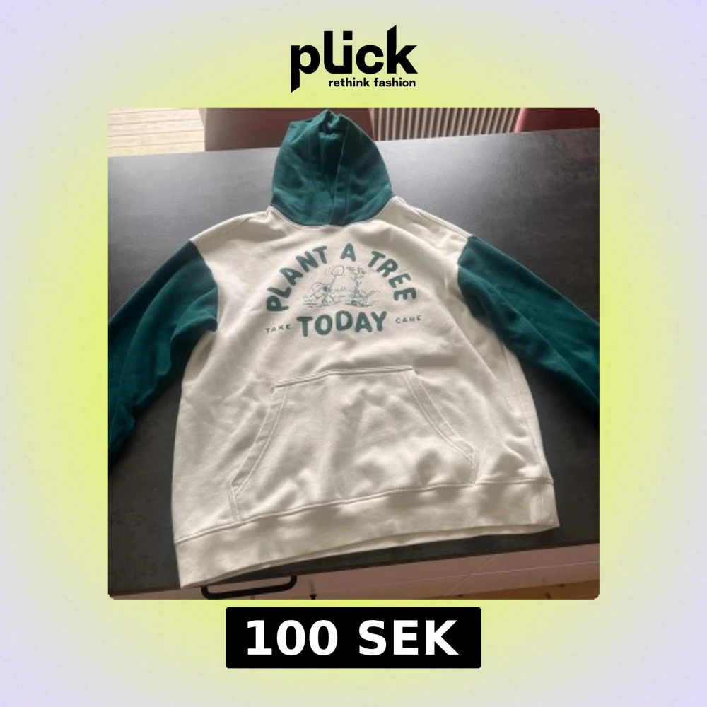 Vit och grön hoodie från H&M x Peanuts med trycket 'Plant a tree today' och illustration framtill. Avslappnad passform, huva och känguruficka. Tillverkad i mjuk bomullsmix, perfekt för chill dagar. Söt Peanuts-figur broderad på ryggen.
