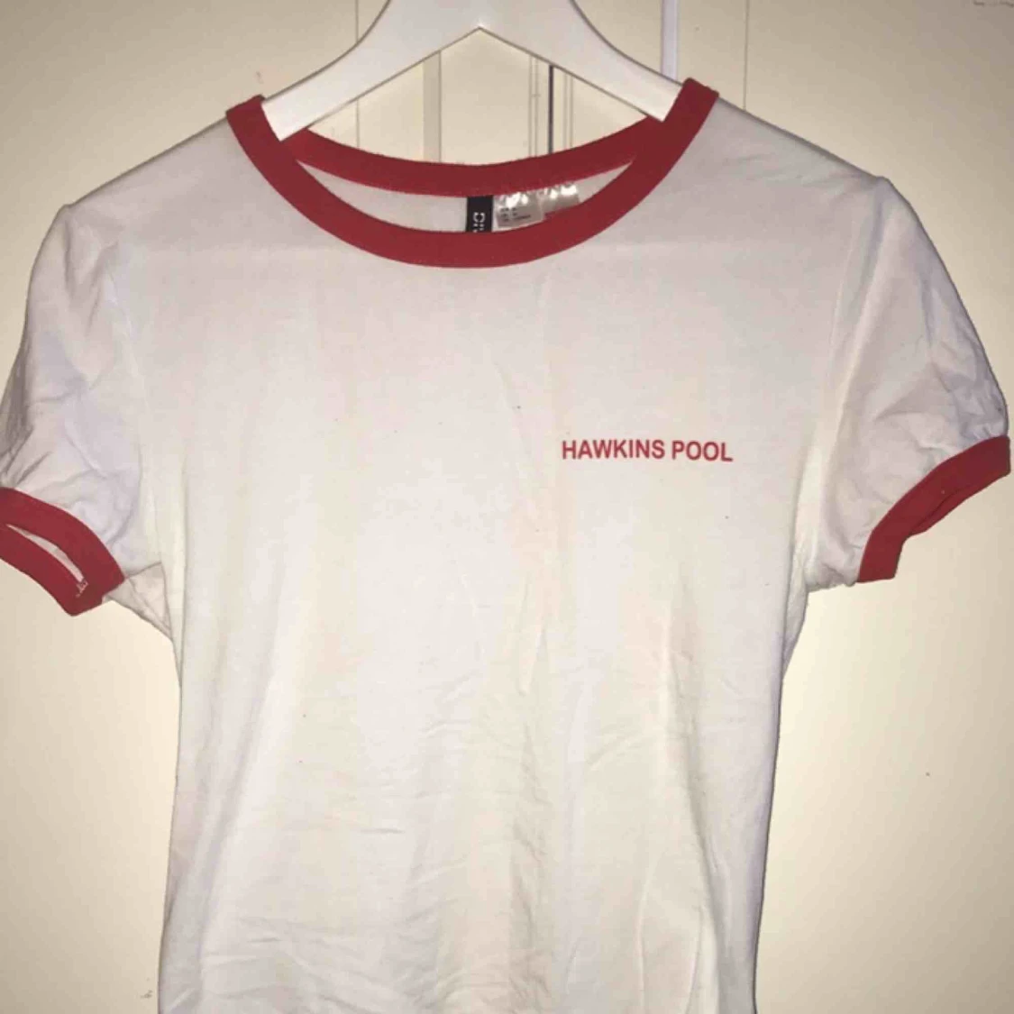 En vit T-shirt med röda ärmar och krage från H&M med tema från Stranger Things🔦. Sparsamt använd och i bra skick