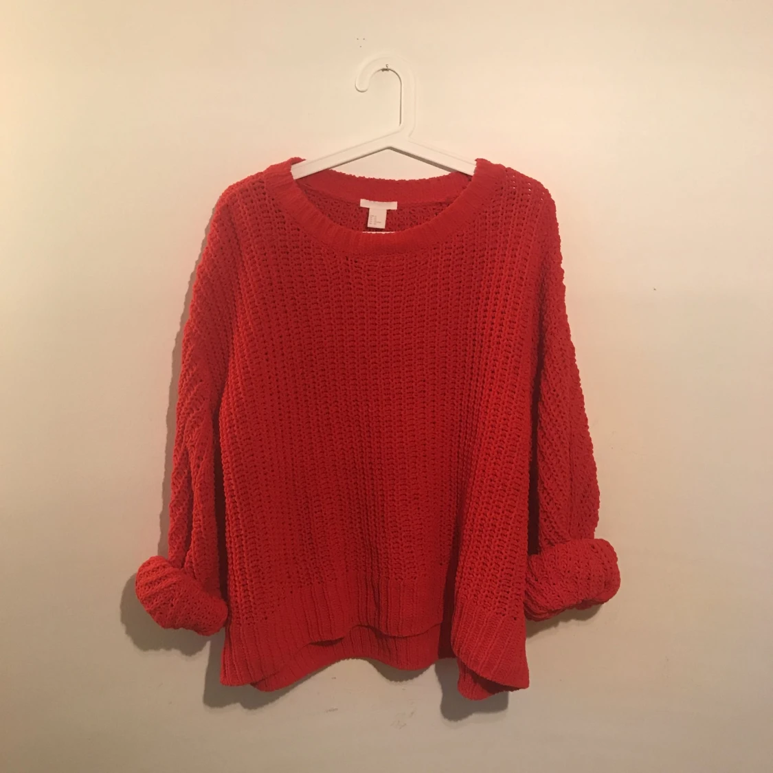Super soft red pullover. I wear a small, looked fine on except for the sleeves which were a bit thick to put under a jacket. The bottom just covered my butt to give you an idea of the size. Still has the tag on.