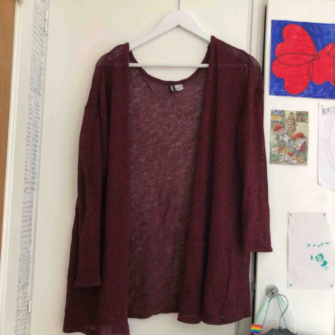 Röd kofta med svarta undertoner från hm, går ungefär till slutet av rumpan.