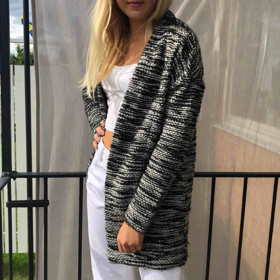 Mysig oversize-kofta i svartvitt mönster. Vid köp av flera plagg kan pris diskuteras. Möter upp i Uppsala eller så står du för frakten!