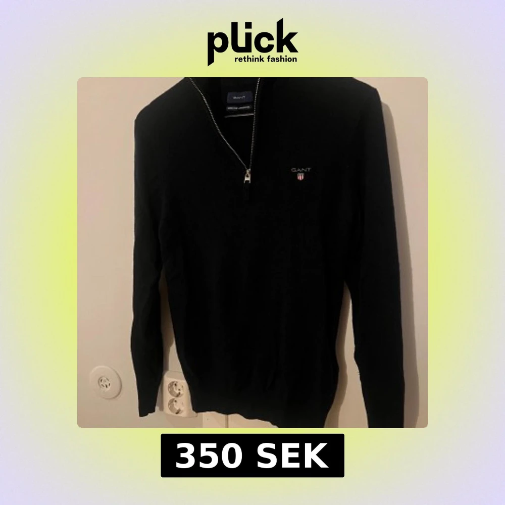Säljer en stilren svart tröja från GANT i superfin lammull. Tröjan har en dragkedja vid halsen och långa ärmar. Den är lite liten i storleken. Perfekt för kyligare dagar.