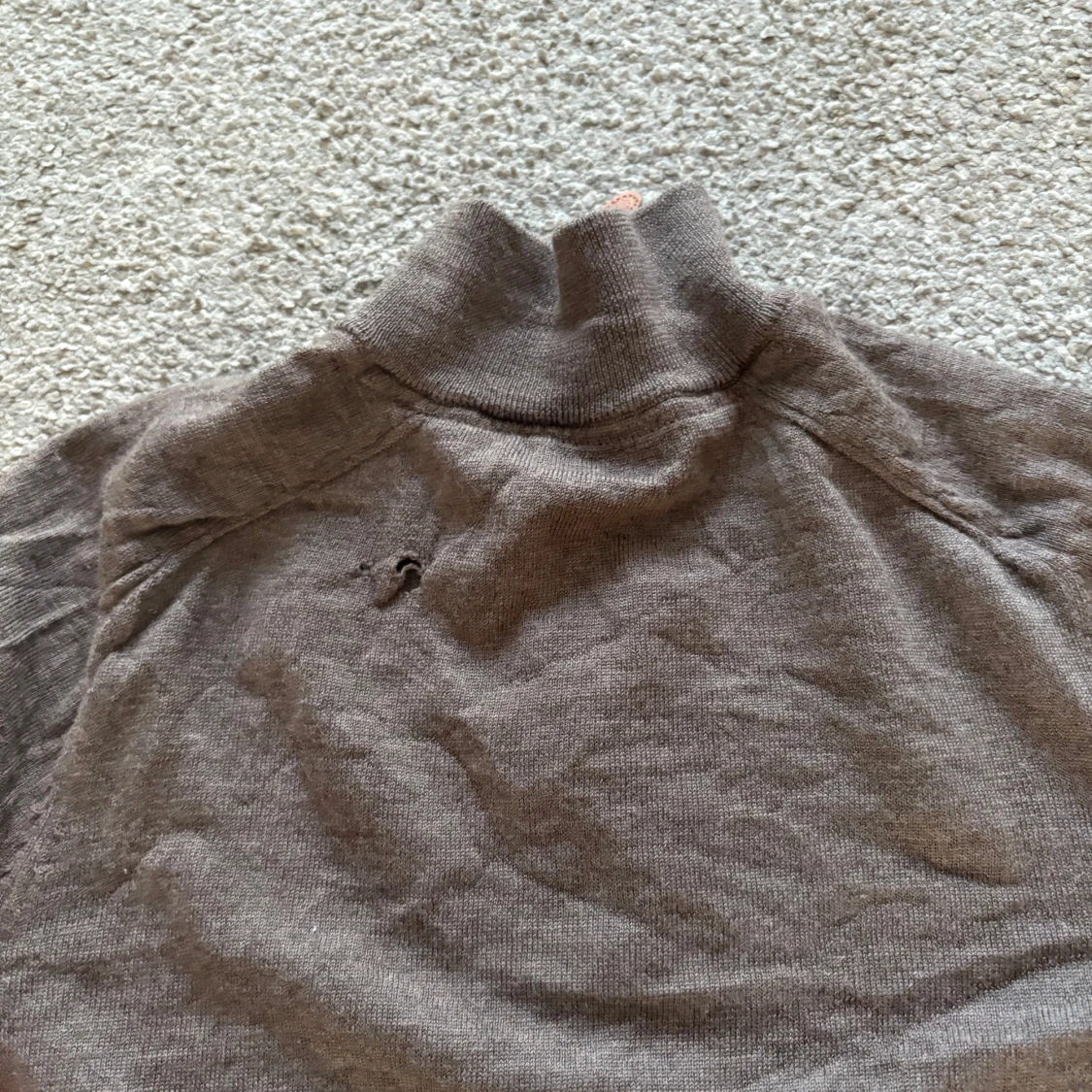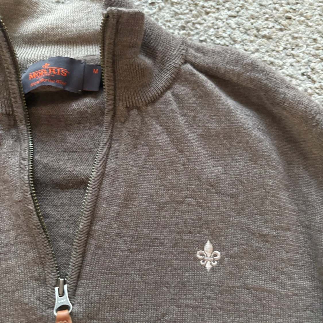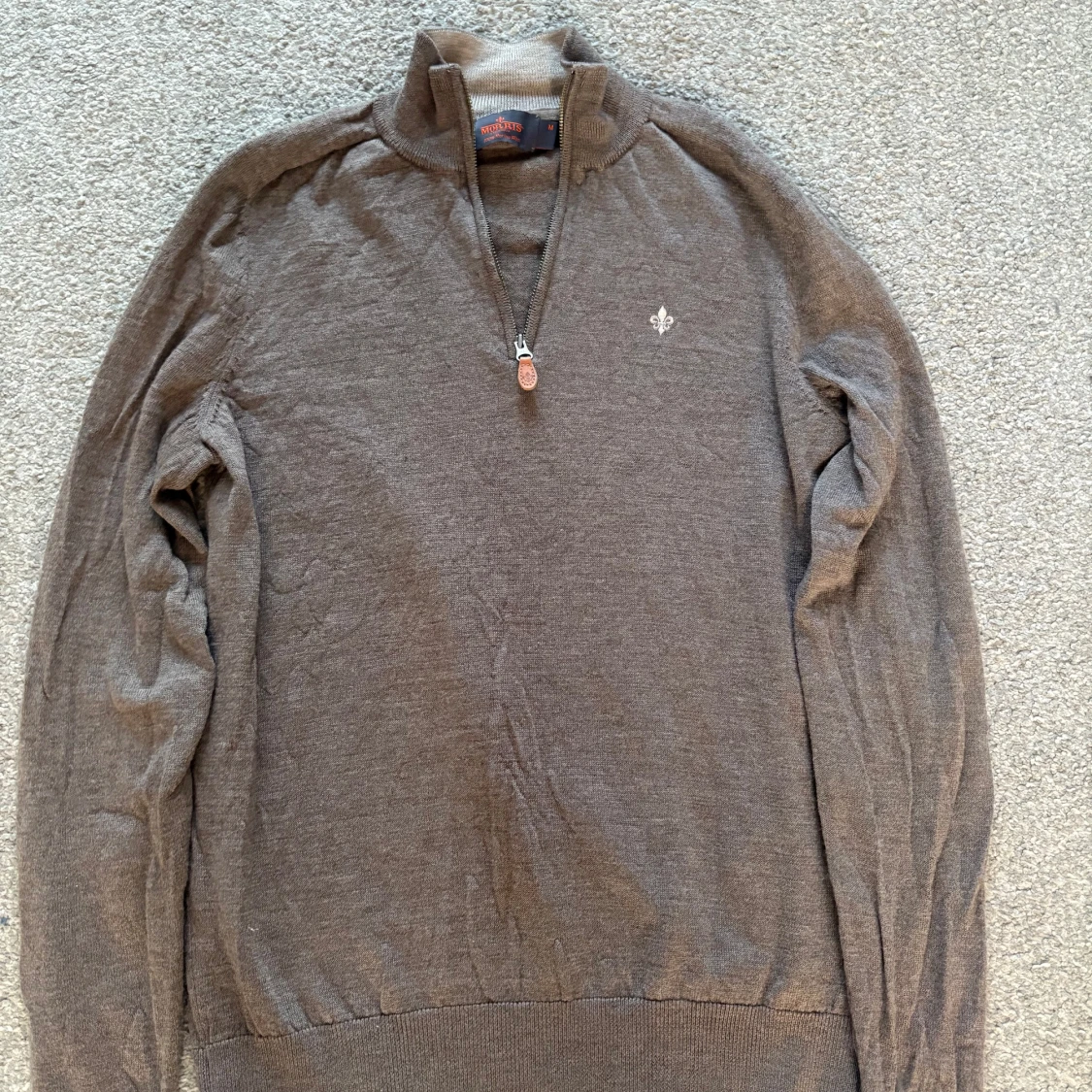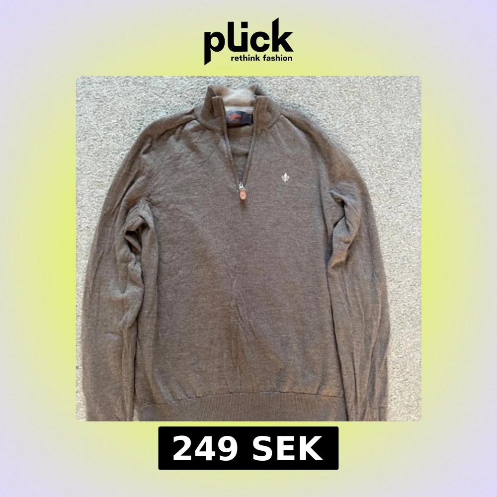 Säljer en brun stickad tröja från Morris med half-zip dragkedja och hög krage. Tröjan har ett litet hål på ryggen som inte syns vid använing men annars är skicket jätte bra.