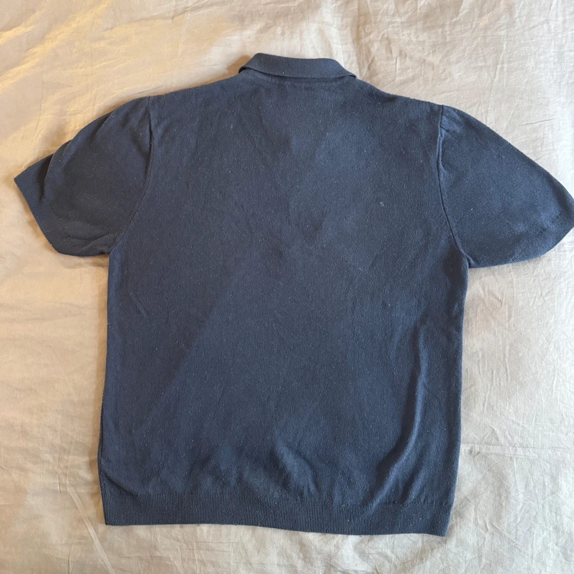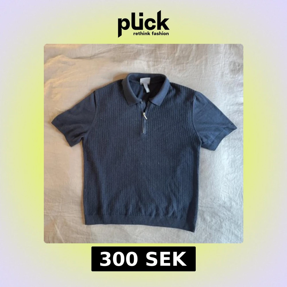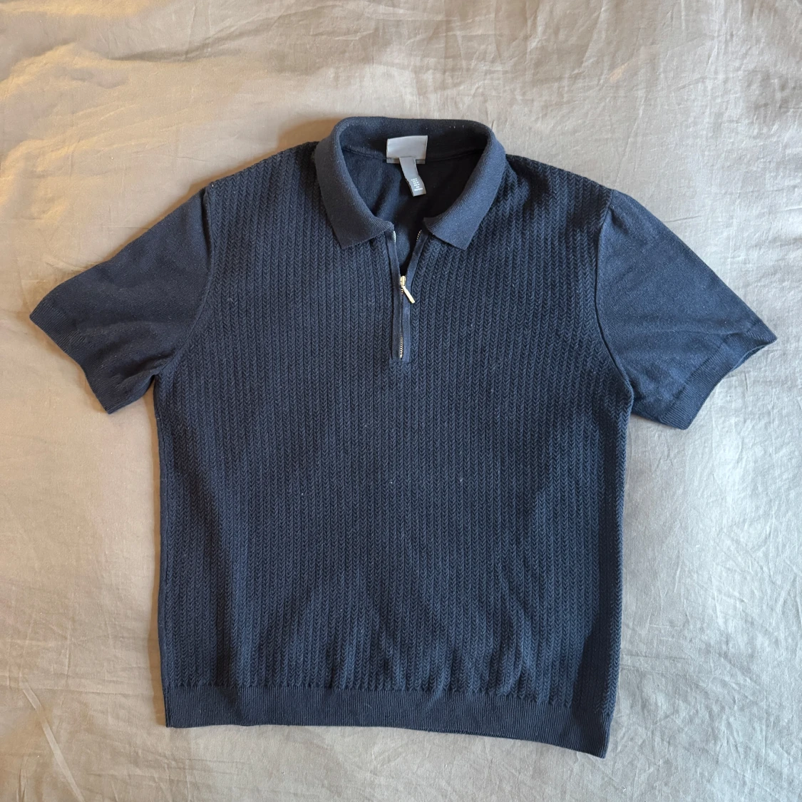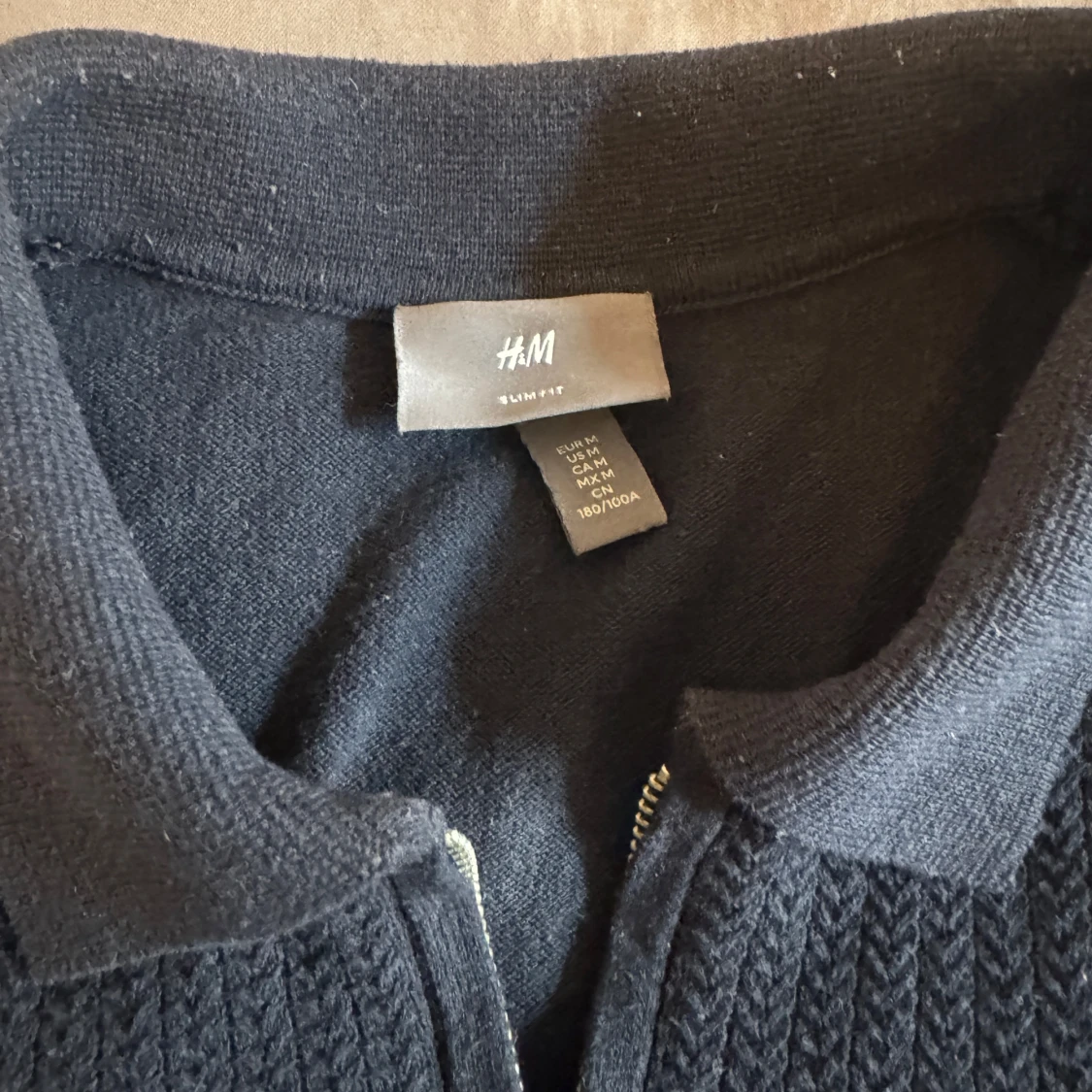 Snygg mörkblå tröja från H&M med krage och half zip-dragkedja. Tröjan är stickad framtill med diskret struktur och har korta ärmar. Slim fit-modell som sitter tajt men bekvämt. Perfekt för dig som gillar stilren och modern look.