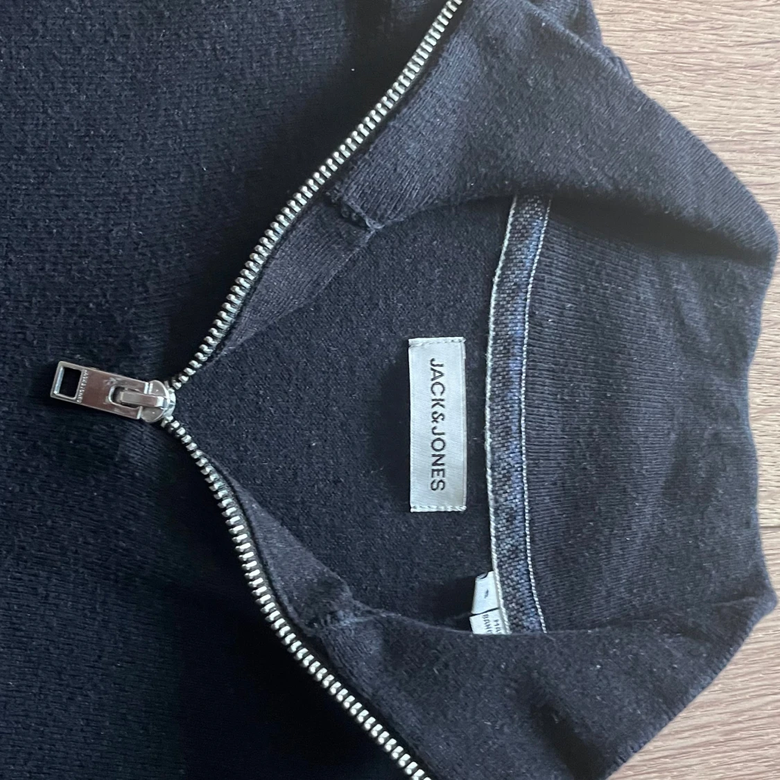 Säljer en svart stickad tröja från Jack & Jones med dragkedja vid halsen. Tröjan har lång ärm och är i en klassisk, normal passform. Perfekt för lager-på-lager och enkel att matcha med olika outfits.