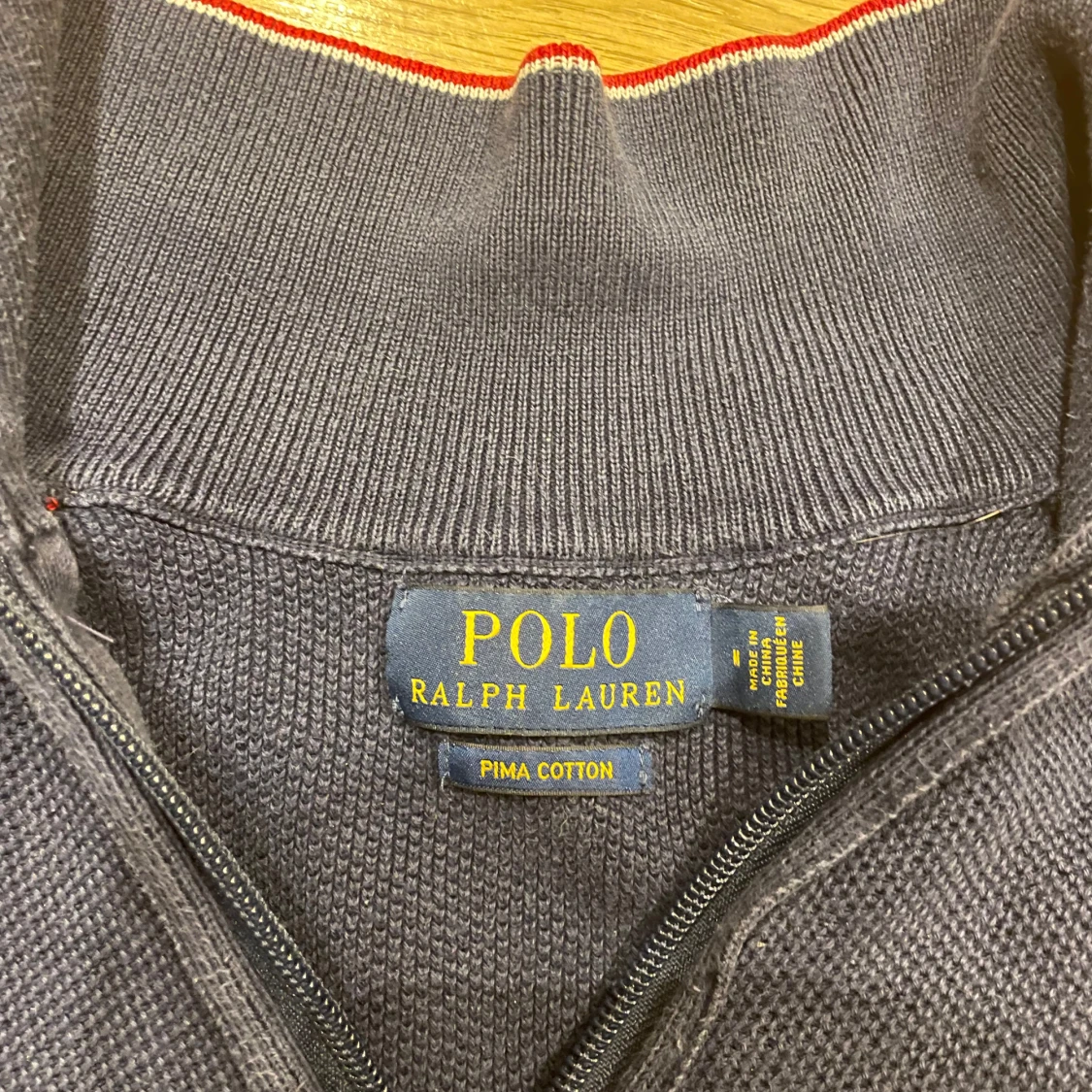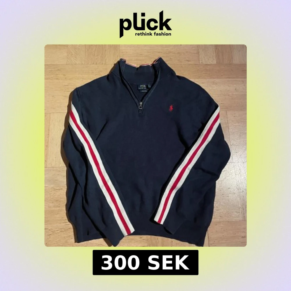 Marinblå stickad tröja från Polo Ralph Lauren med half zip och klassisk röd logga på bröstet. Snygga vita och röda ränder längs ärmarna ger en unik stil. Tröjan är väldigt ovanlig då den inte längre säljs.