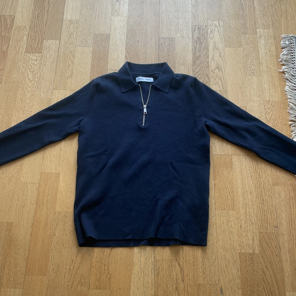 Snygg mörkblå långärmad pikétröja från Samsøe Samsøe med klassisk krage och dragkedja framtill. Perfekt för en stilren och avslappnad look. Mjukt material och enkel att matcha.