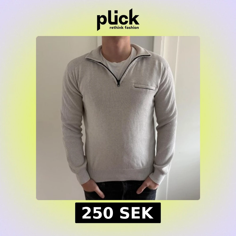 Snygg stickad tröja med half zip och ribbade ärmar. Tröjan har en liten bröstficka med dragkedjedetalj och en klassisk krage. Skulle säga att färgen är cream/ljusgrå aktig