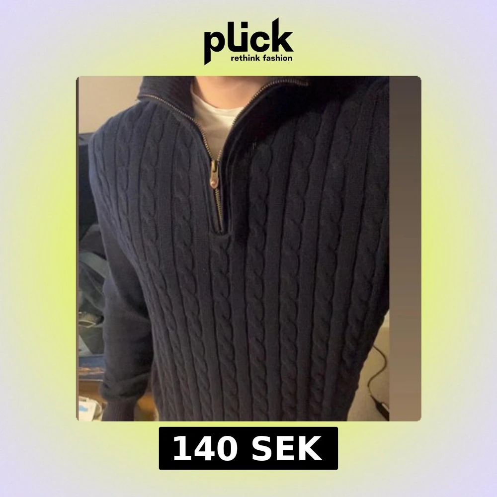 Säljer en snygg mörkblå stickad tröja från Hampton Republic med dragkedja vid halsen. Tröjan har ett klassiskt flätmönster och vanlig på ärmarna. Passar M
