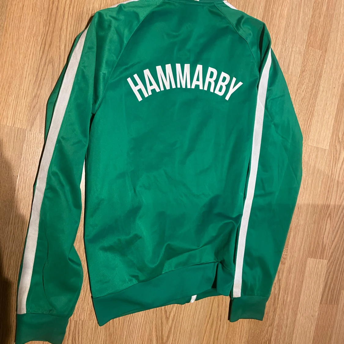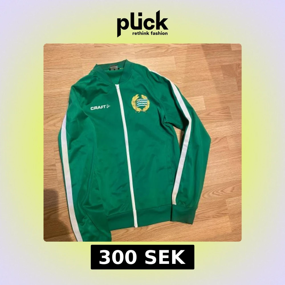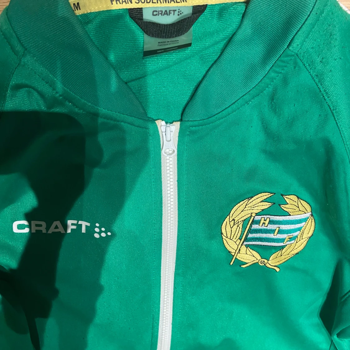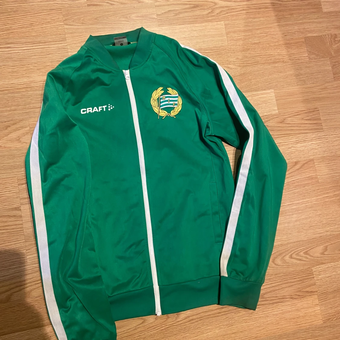 Grön ziptröja från Craft med Hammarby IF-logga på bröstet och vita ränder längs ärmarna. Står 'HAMMARBY' på ryggen. Köpt på skrapan för 750.