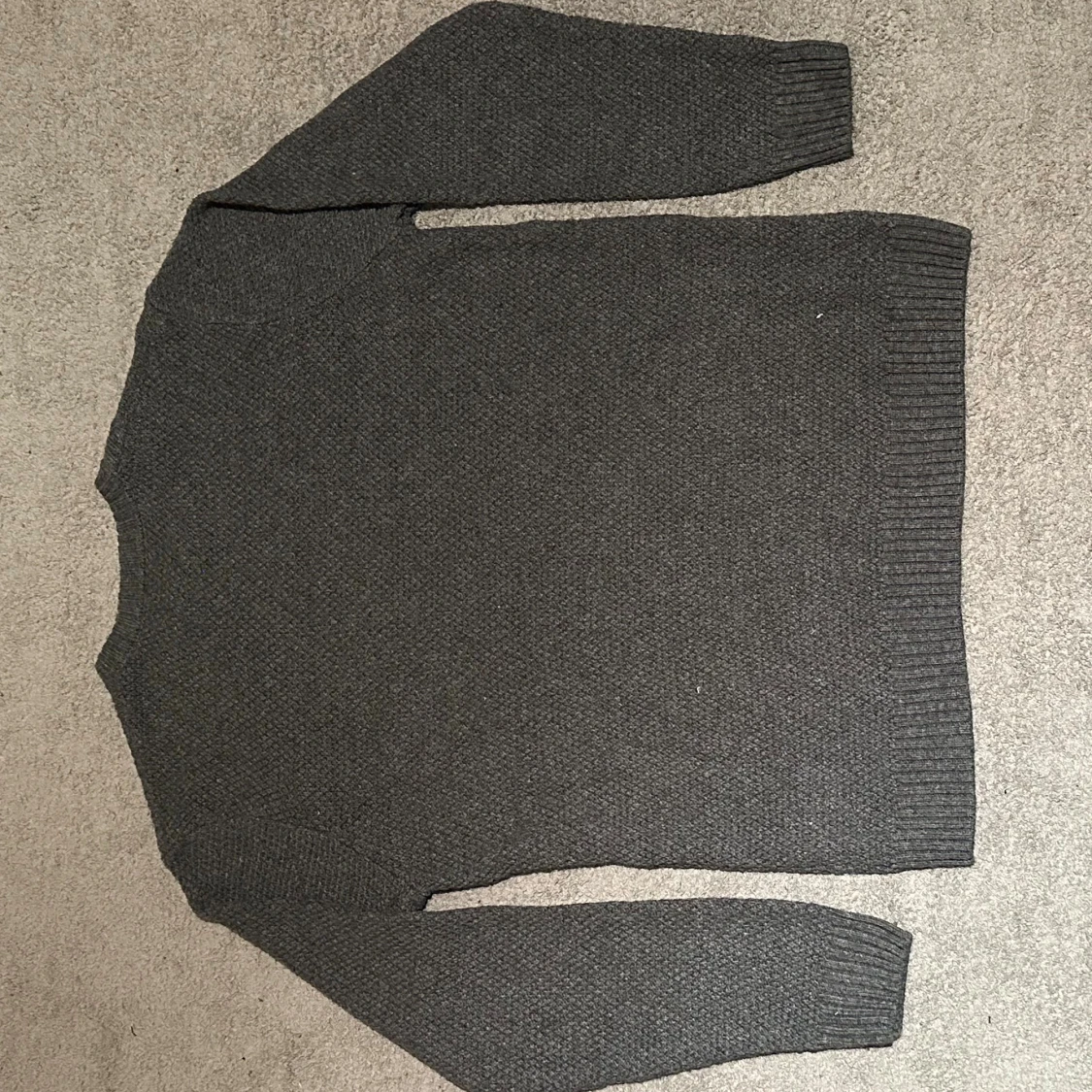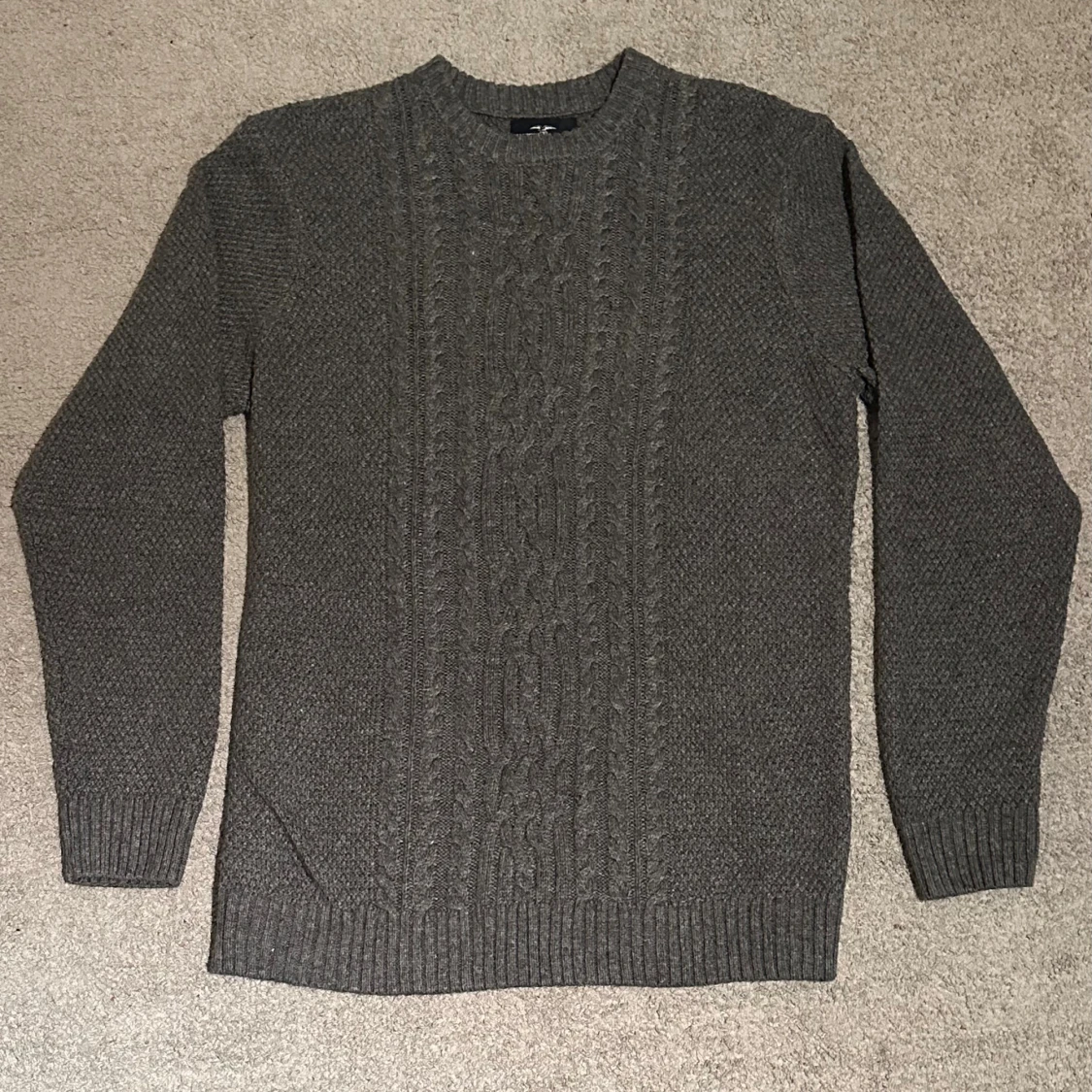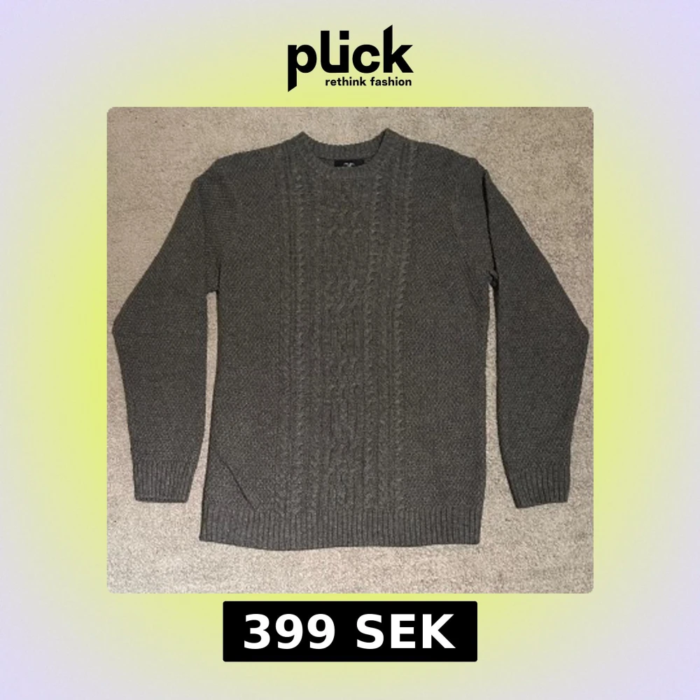 Snygg mörkgrå stickad tröja med klassiskt kabelmönster framtill och ribbade muddar vid ärmslut och nederkant. Tröjan har rund hals och långärmade ärmar, perfekt för dig som gillar en enkel men stilren look.