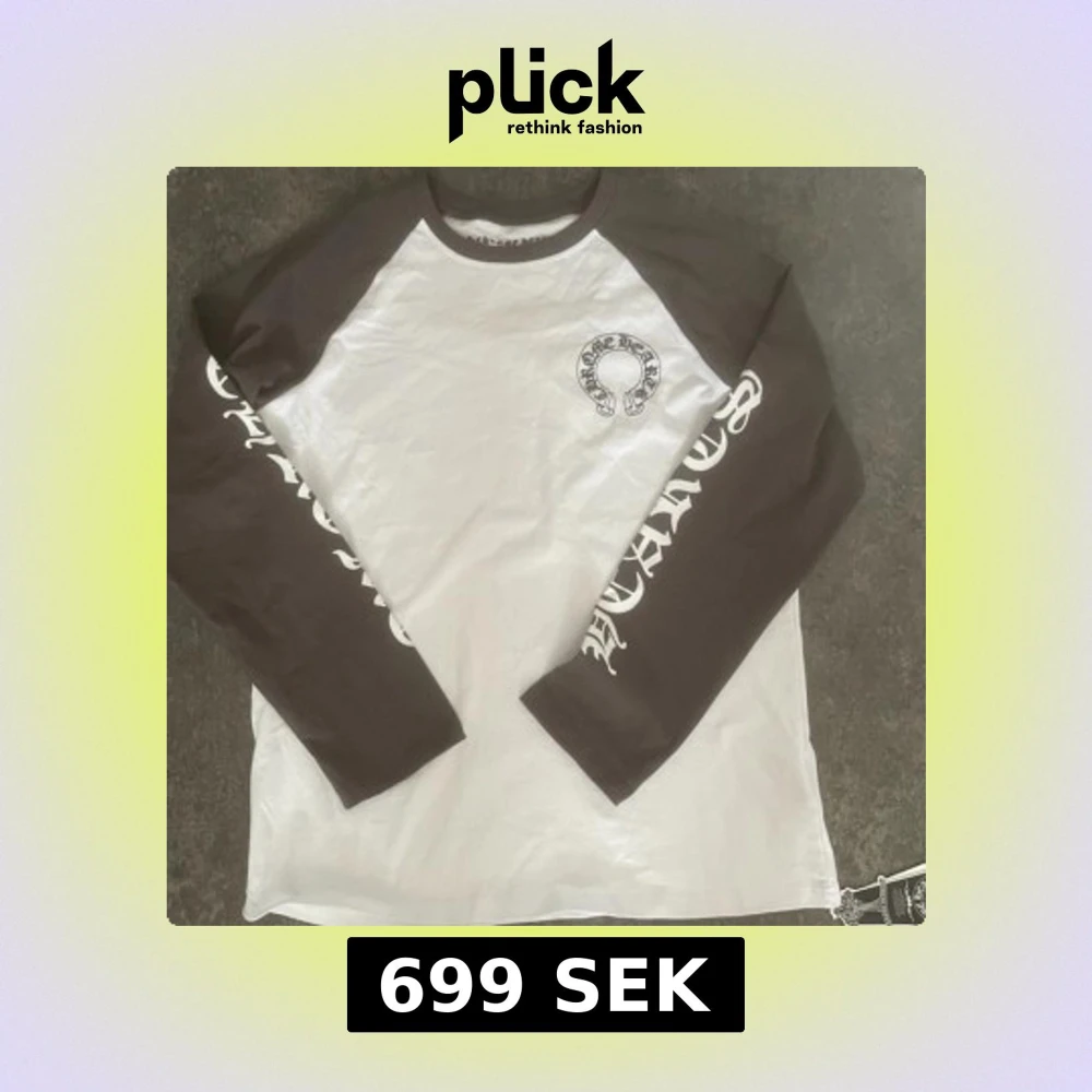 Säljer en långärmad tröja från Chrome Hearts med svartvita ärmar och tryck på både bröst, rygg och ärmar. Klassisk baseballmodell med kontrastfärgade ärmar och rund halsringning.