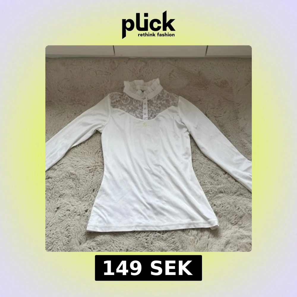 Elegant vit långärmad topp med spetsdetaljer på framsida och rygg. Har en hög krage med volang och knappar framtill. Perfekt för tävling. Nypris: 499kr Mitt pris 149kr + frakt. Kontakta gärna innan köp nu, säljer en likadan utan gul text❣️