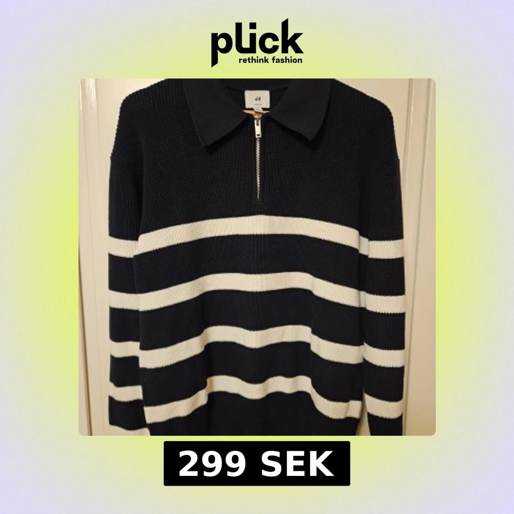Säljer en snygg randig half-zip från H&M i mörkblå och vit. Den är tillverkad i 100% bomull och har en loose fit passform. Stolek S. Nypris ca 700 kr.