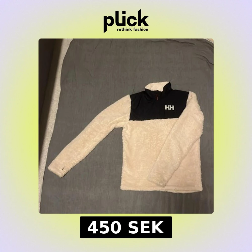 Säljer en vit/crémefärgad lurvig fleecejacka från Helly Hansen med mörkblå panel upptill och hög krage. Jackan har lång ärm och HH-logga på bröstet(reflex). Perfekt för kyliga dagar och outdoor-aktiviteter.