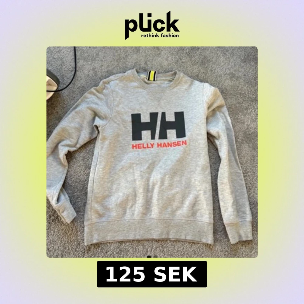 Säljer en grå sweatshirt från Helly Hansen med deras ikoniska HH-logga i svart och rött på framsidan. Tröjan har långa ärmar och en rund halsringning. Perfekt för en avslappnad stil.