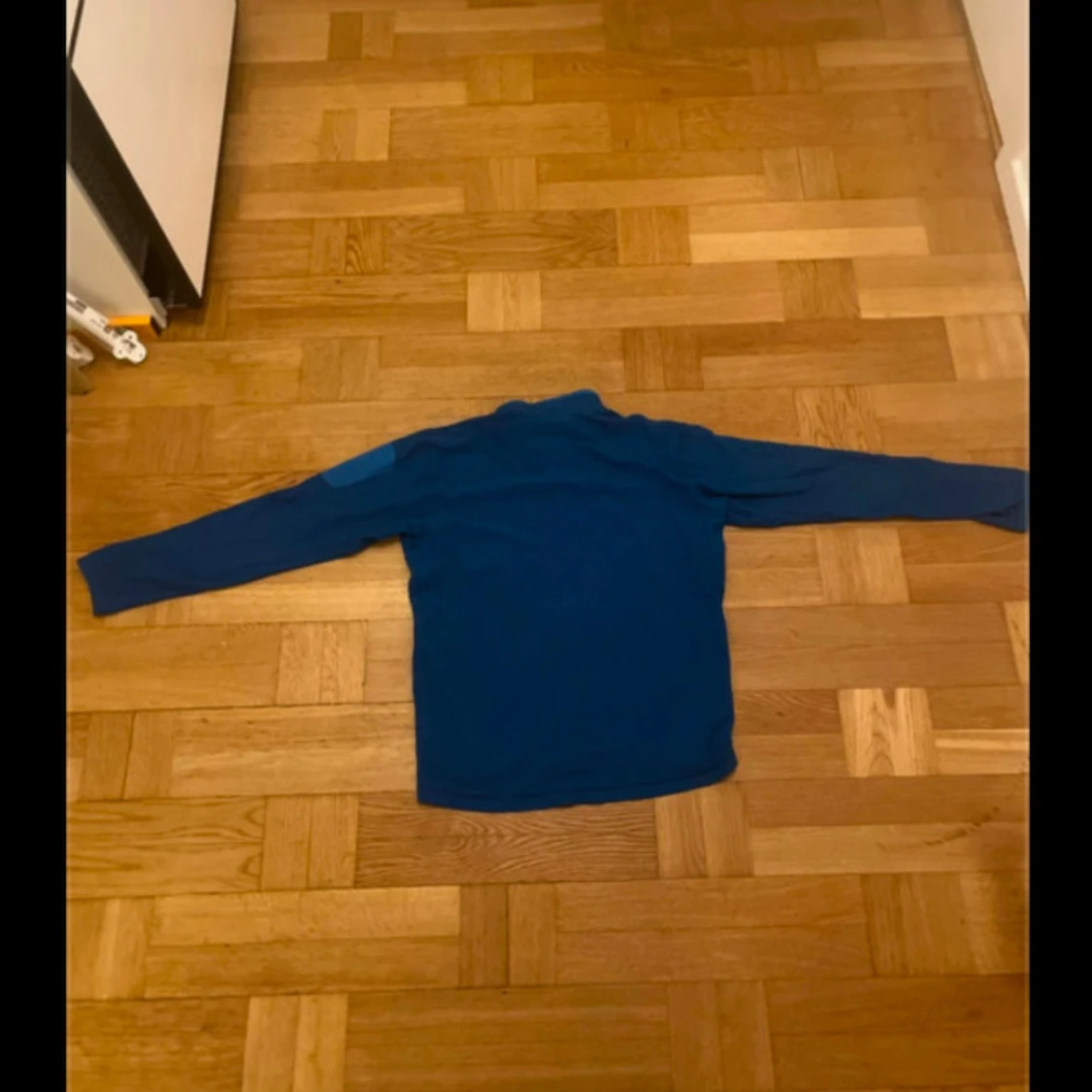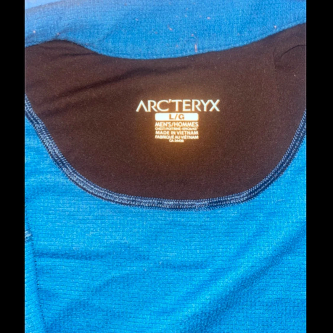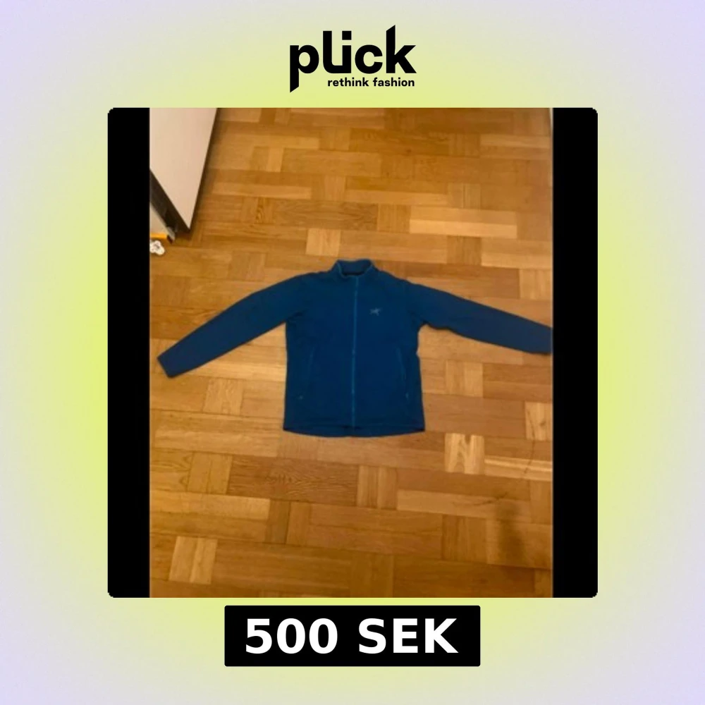 Säljer en blå fleecejacka från Arc'teryx med dragkedja framtill. Perfekt för kyliga dagar och outdoor-äventyr. Jackan har långa ärmar och en stilren design.