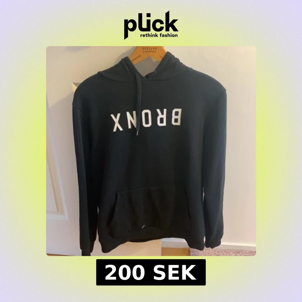 Säljer en svart hoodie med texten 'BRONX' i vitt på framsidan. Tröjan har en klassisk design med huva och känguruficka. Perfekt för en avslappnad stil.