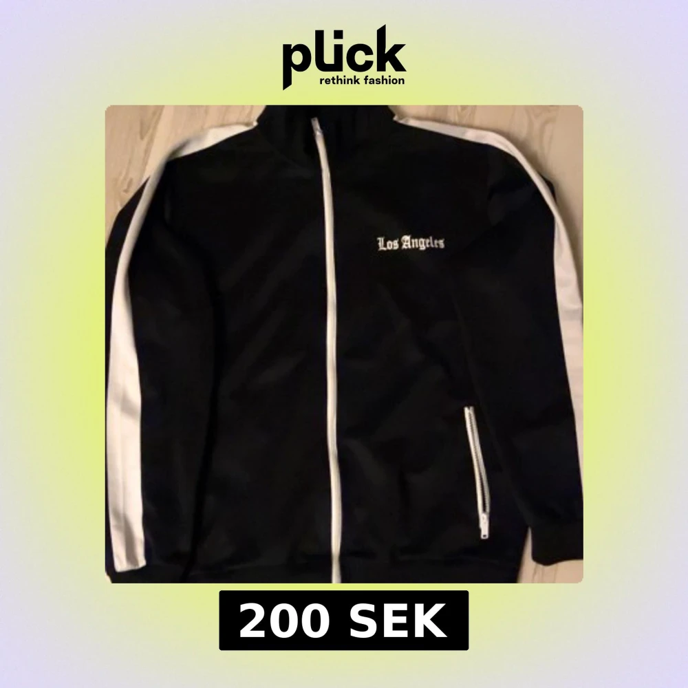 Snygg svart träningsjacka med vitt Los Angeles-tryck på bröstet. Jackan har vita detaljer längs ärmarna och dragkedja framtill. Perfekt för en sportig look.