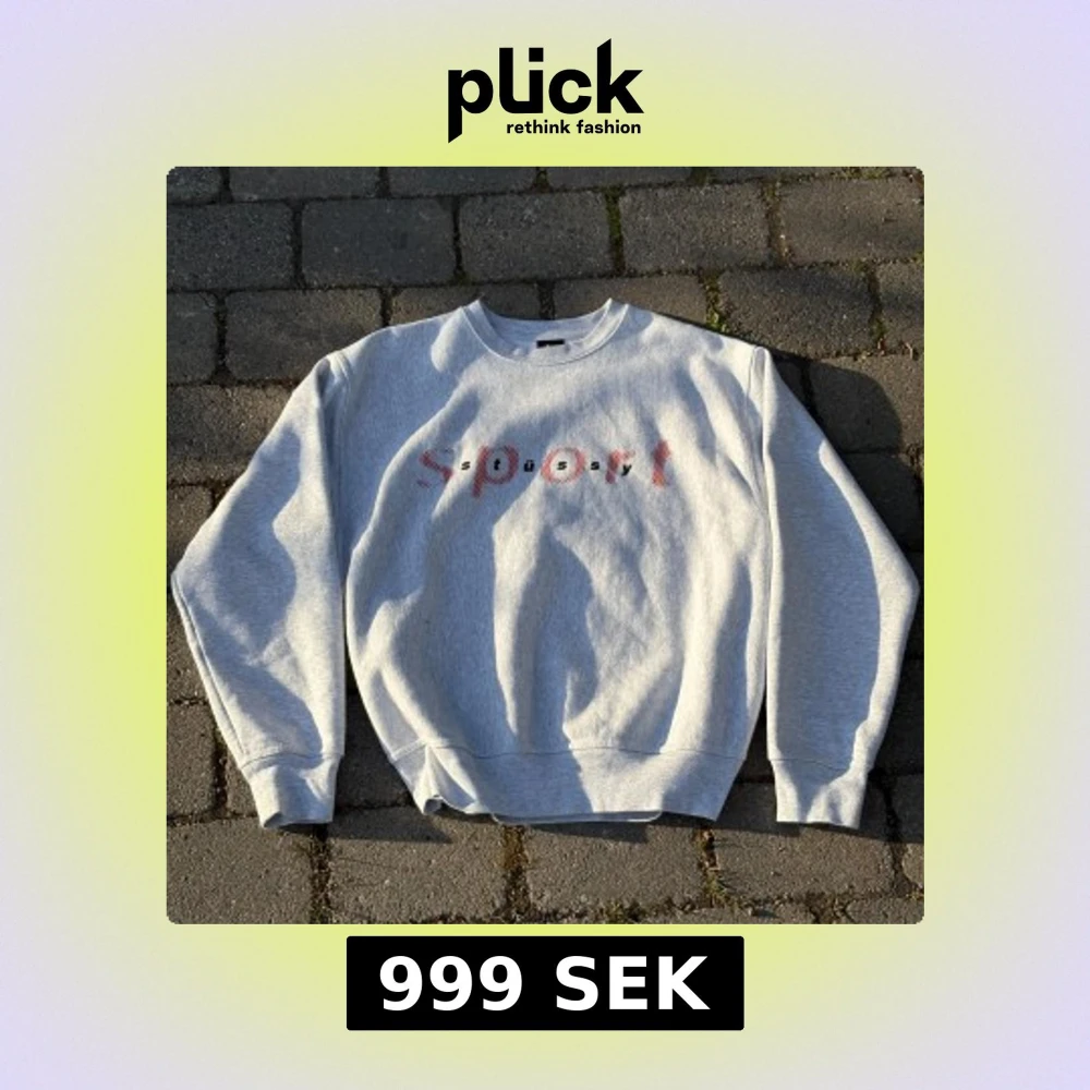 Säljer en ljusgrå sweatshirt från Stussy i storlek M. Tröjan har rund halsringning.
