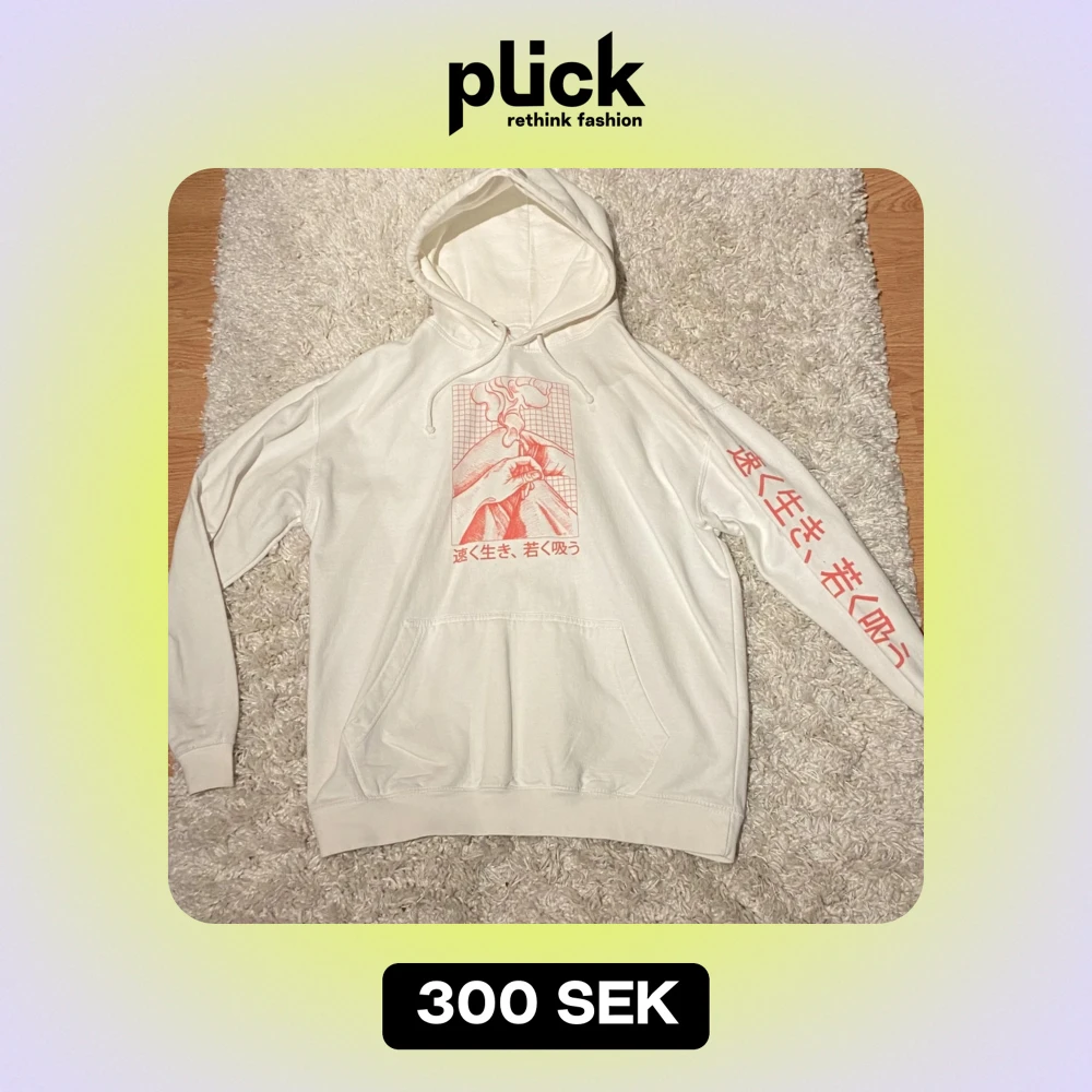 Säljer en vit Erick Khan hoodie med en cool röd grafik på framsidan och text på ärmen. Den har en stor ficka fram och justerbar huva. Perfekt för en avslappnad stil och att hålla sig varm under kyliga dagar. Passar bra till jeans eller joggers!