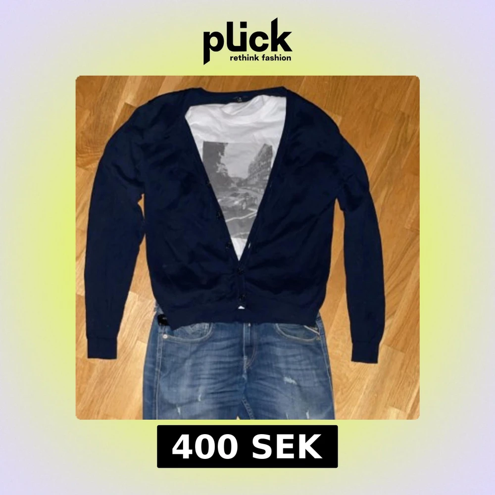 Säljer en mörkblå cardigan från Matinique i storlek M. Den borde även passa storlek S
