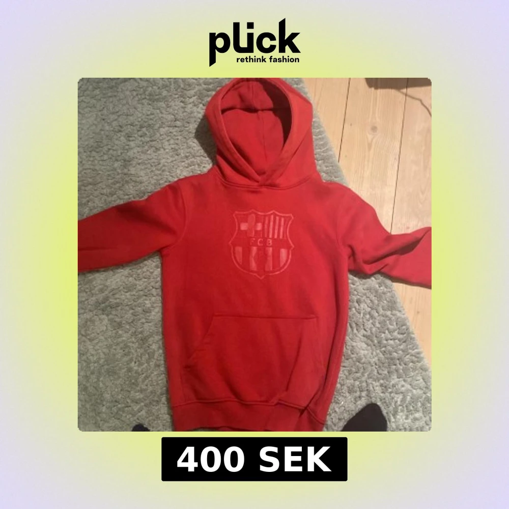 Säljer en röd hoodie med FCB-logga på bröstet. Tröjan har en klassisk känguruficka och en bekväm huva. Perfekt för fotbollsfans som vill visa sitt stöd. Passar bra till vardags och sportiga aktiviteter.Köpte den i barcelona för 1200