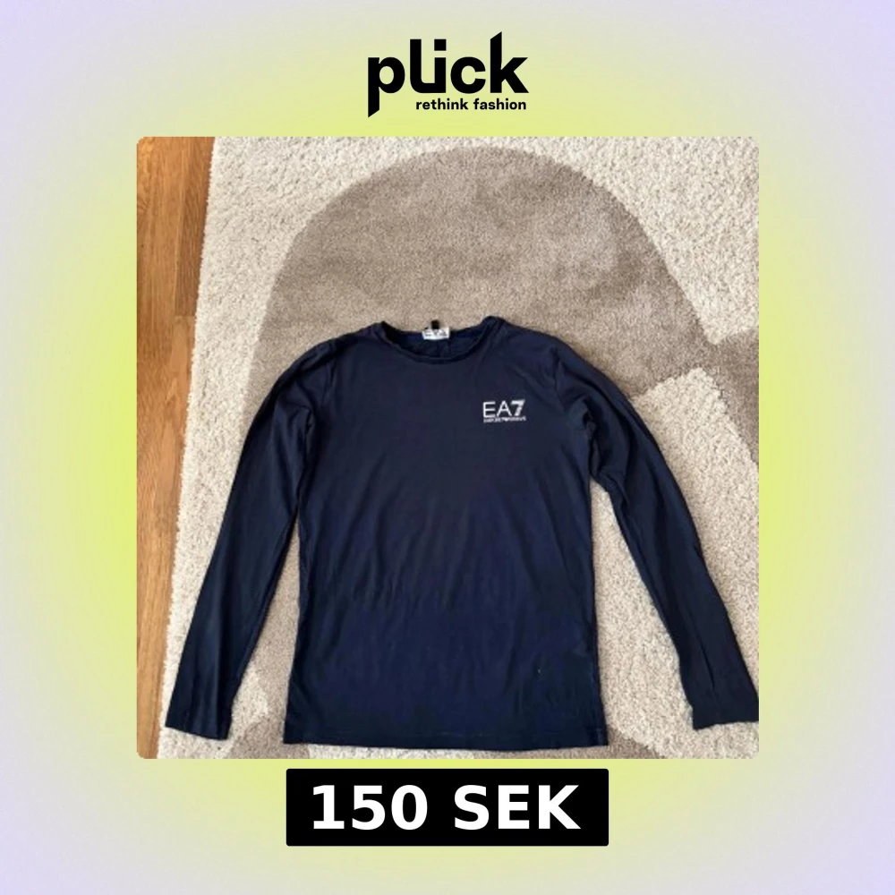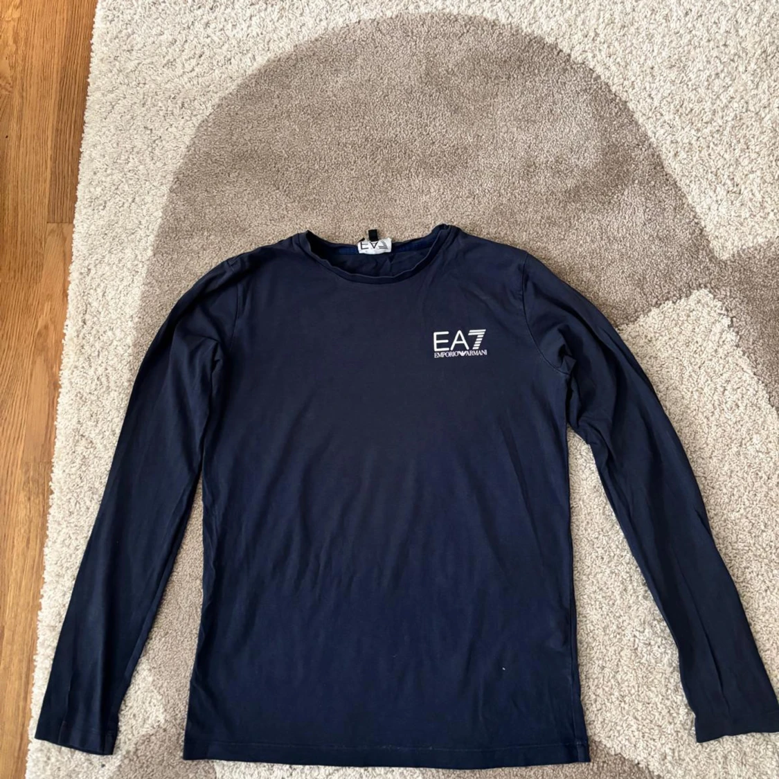 Säljer en stilren mörkblå långärmad tröja från EA7 Emporio Armani. Tröjan har rund halsringning och en vit EA7-logga tryckt på bröstet. Perfekt för en clean och sportig look.
