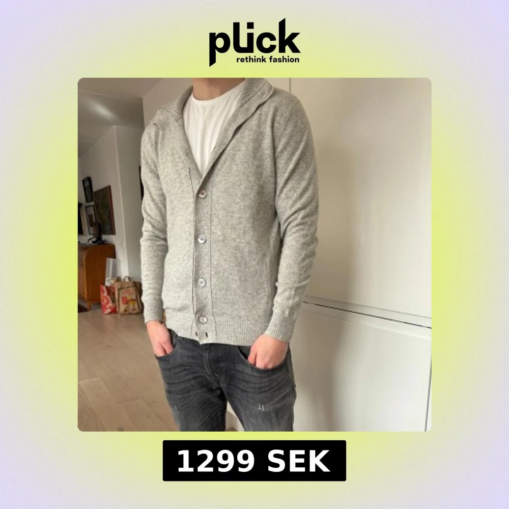 Säljer en stilren grå kofta med knappar framtill. Den har en ribbad kant vid ärmslut och nederkant, vilket ger en snygg passform. Perfekt för kyligare dagar!