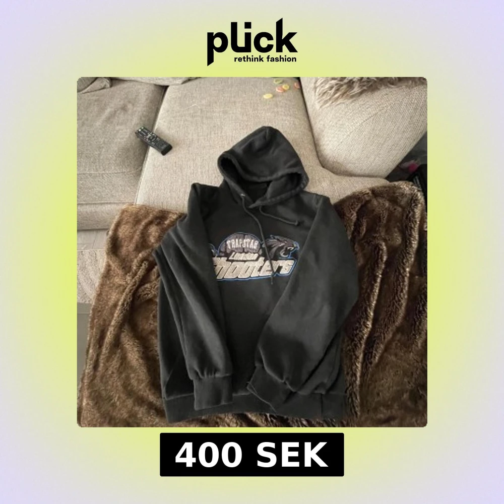 Säljer en svart hoodie från Trapstar med tryck på bröstet i vitt och blått. Tröjan har huva med dragsko och ribbade muddar vid ärmslut och nederkant. Perfekt för en avslappnad och cool stil.