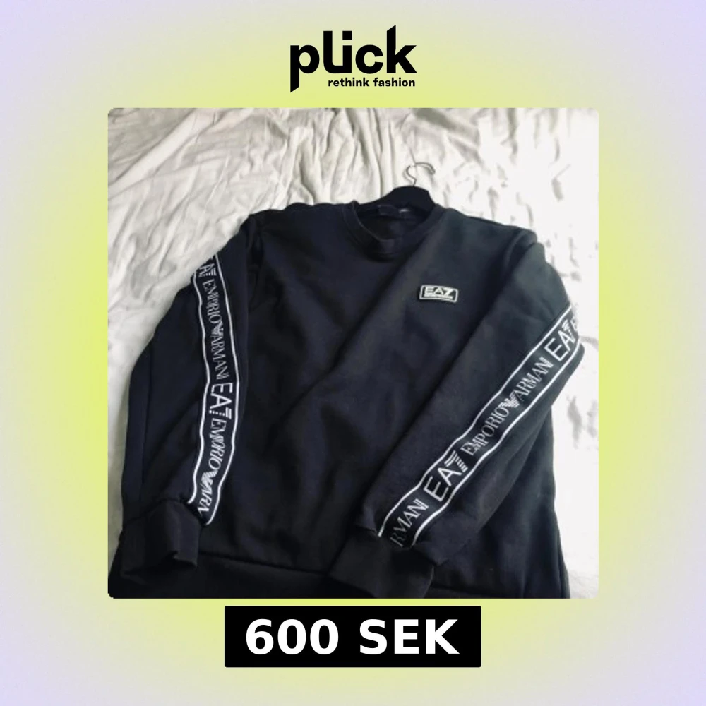 Svart sweatshirt från EA7 Emporio Armani med logga på bröstet och tryck längs båda ärmarna. Rund halsringning och ribbade muddar vid ärmslut och nederkant. Snygg och stilren design som passar perfekt till streetwear.